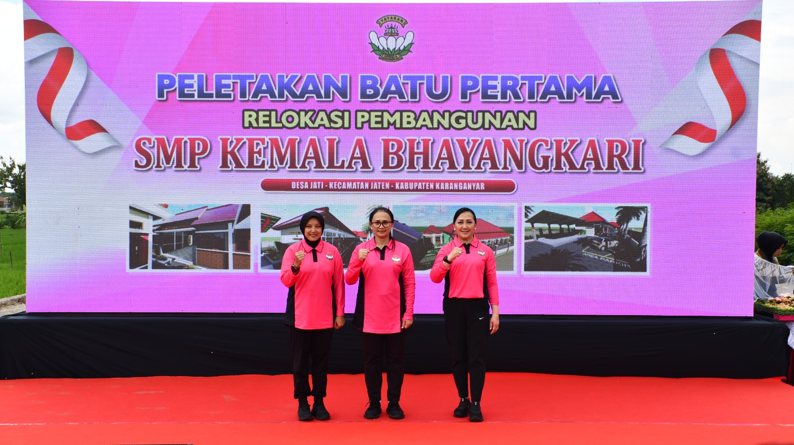 KARANGANYAR, BUSERJATIM. COM-Ketua Pembina Yayasan Kemala Bhayangkari, Ny. Juliati Sigit Prabowo memimpin prosesi peletakan batu pertama gedung baru SMP Kemala Bhayangkari. Sekolah tersebut berada di Dukuh Jati, Desa Jati, Kecamatan Jaten, Kabupaten Karanganyar, dengan lahan seluas 3220 meter persegi.