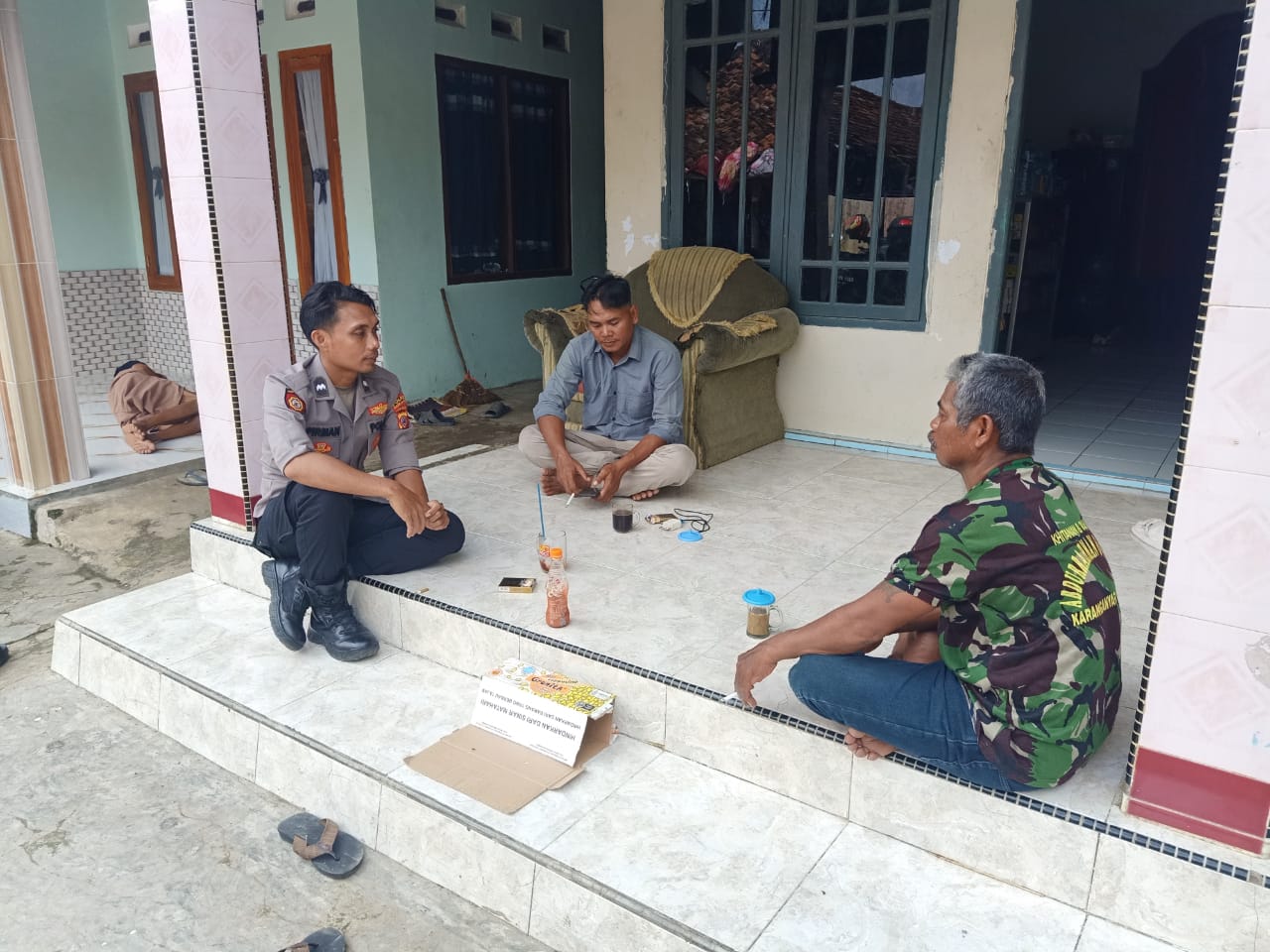 Indramayu – Duduk lesehan di teras rumah warga, Aiptu Wahyu, Bhabinkamtibmas Desa Lohbener, Polsek Lohbener, Polres Indramayu Polda Jabar tampak akrab berbincang dengan dua masyarakat desa setempat.