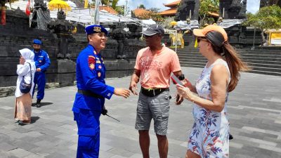 Sambang Patroli dengan Jalan Kaki dan Dialogis serta memberikan himbauan kepada Para Wisatawan / Pengunjung, Pelaku Usaha Wisata, Photographer, Pedagang dan warga masyarakat yang beraktivitas di Pesisir Pantai dan Kawasan DTW Tanah Lot Kediri Tabanan dan DTW lainnya ,serta dihimbau untuk berhati- hati mengingat permukaan batu karang dalam keadaan licin