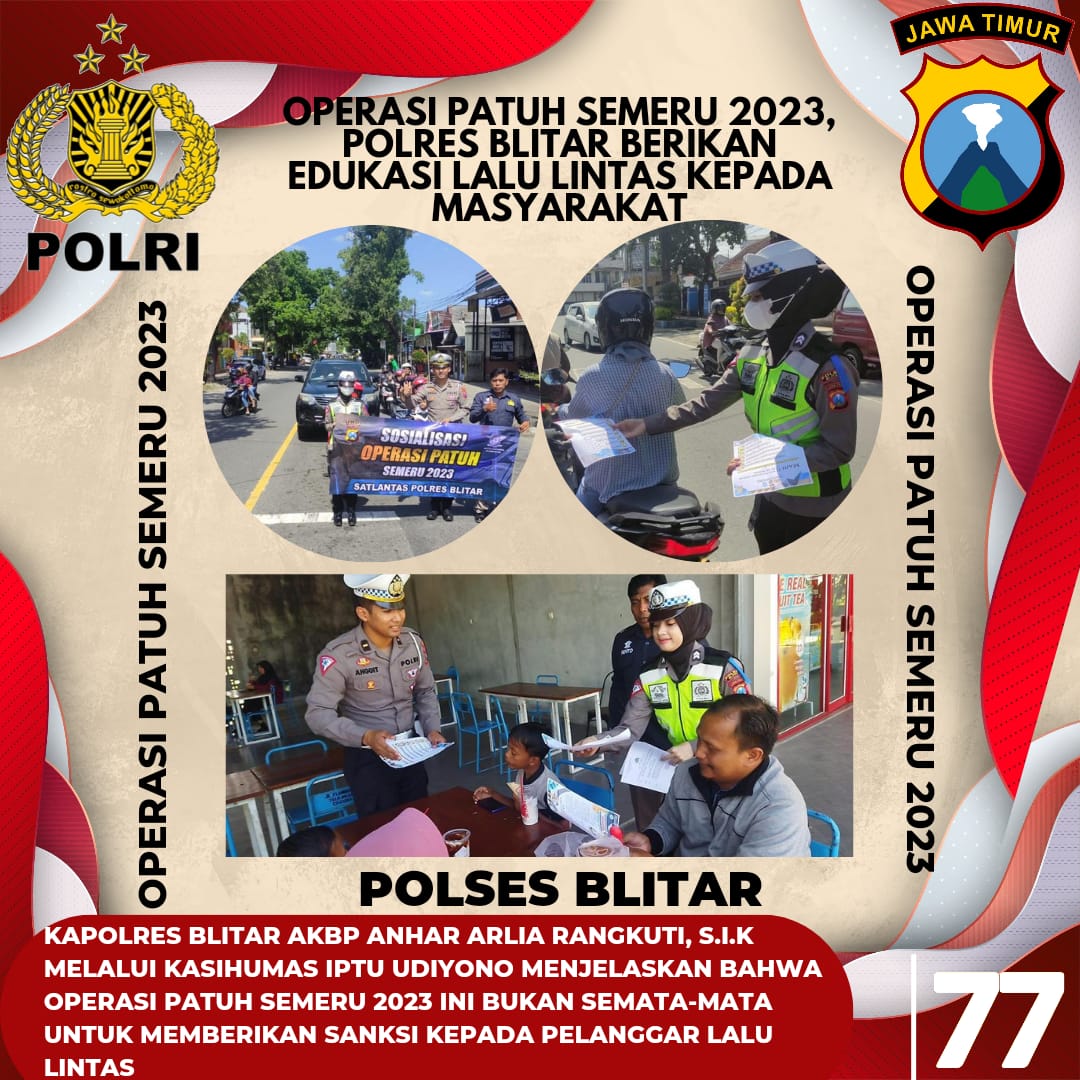 Kapolres Blitar AKBP Anhar Arlia Rangkuti, S.I.K Melalui Kasihumas IPTU Udiyono menjelaskan bahwa Operasi Patuh Semeru 2023 ini bukan semata-mata untuk memberikan sanksi kepada pelanggar lalu lintas, tetapi lebih mengedepankan pendekatan edukatif guna menciptakan kesadaran kolektif dalam berlalu lintas.