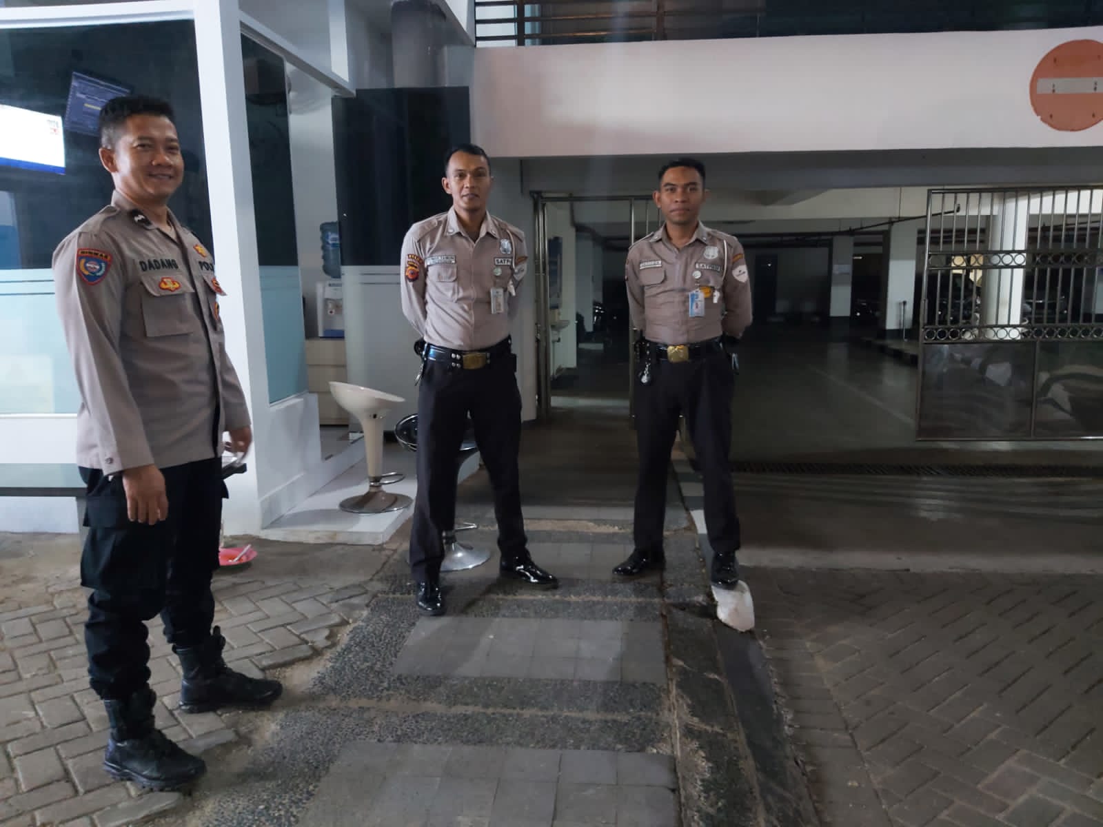 Selama patroli, petugas aktif berkomunikasi dengan security kantor perbankan dan memberikan himbauan terkait keamanan.