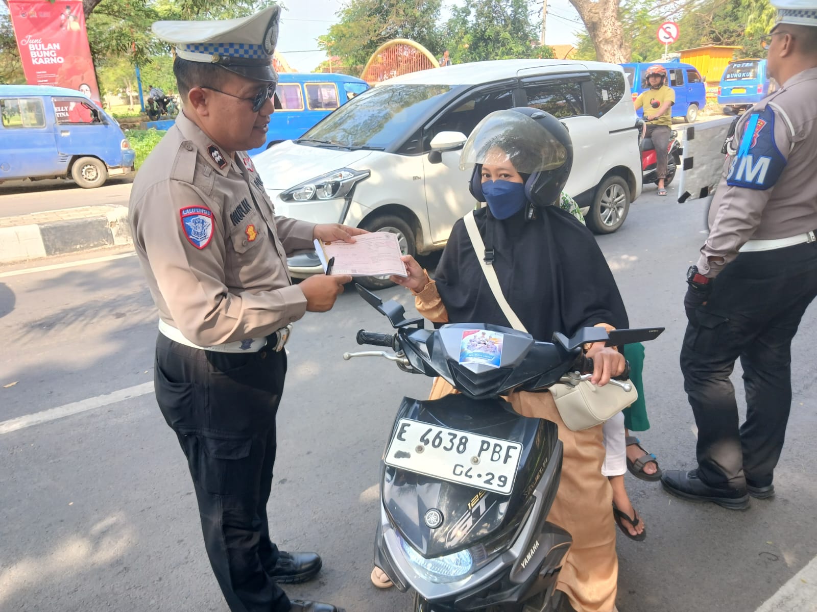 Petugas tampak menyapa para pengemudi dengan senyuman sambil membagikan leaflet keselamatan berkendara dan menempelkan stiker imbauan pada kendaraan, baik roda dua maupun roda empat.