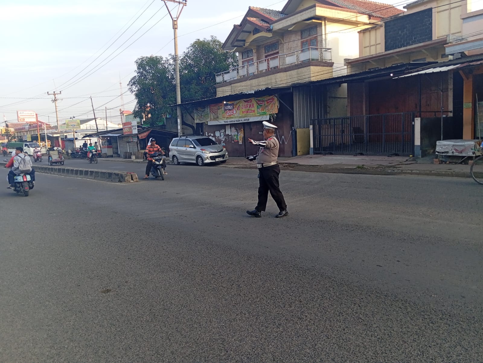 Tampak AIPTU Dedi Mardiana, S.H., berdiri di tengah jalan mengatur arus kendaraan.