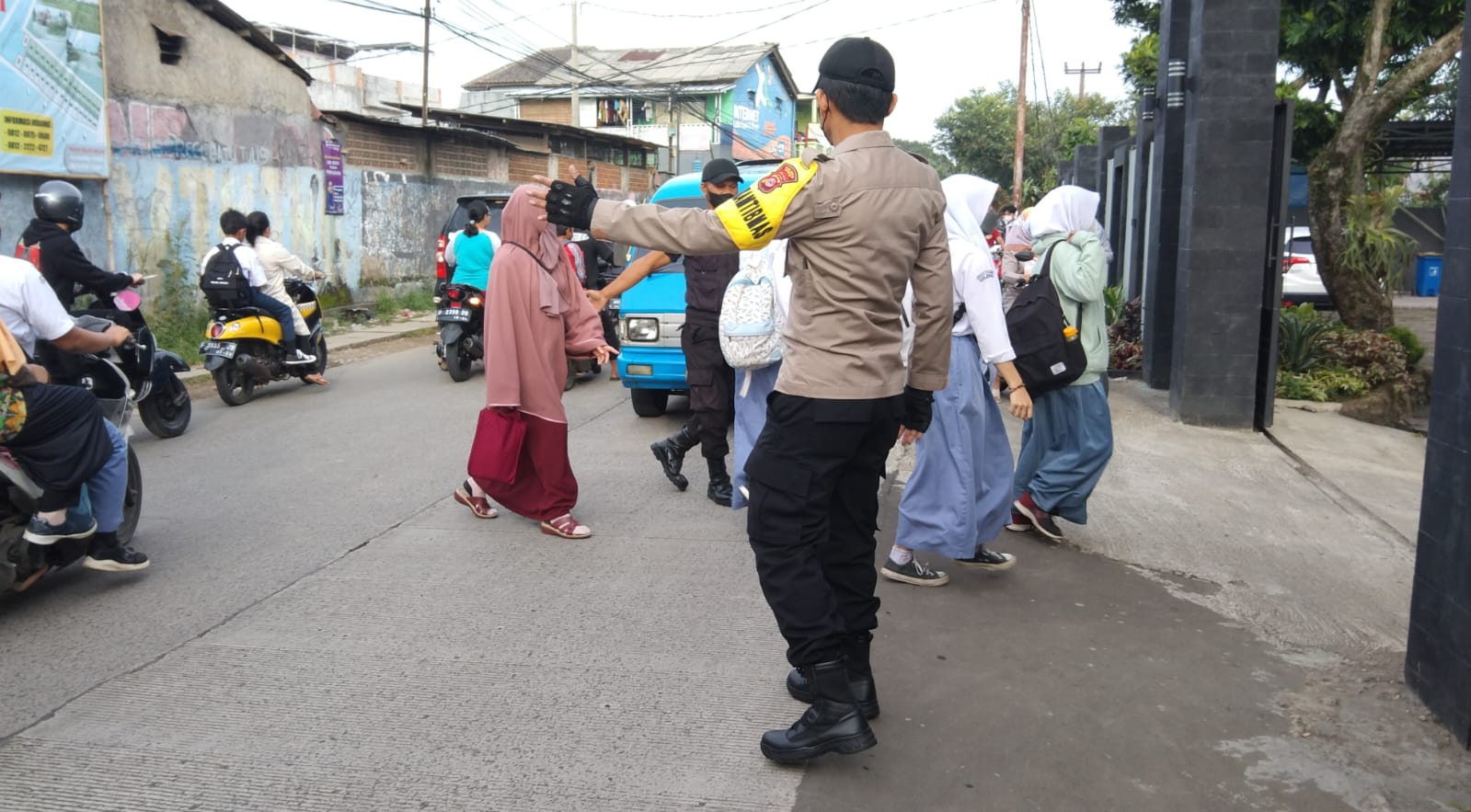 Bhabinkantibmas Desa Banjarwaru Aiptu Y. Arie selain melaksanakan giat rutin memelihara Kamtibmas di desa binaanya, Bhabinkamtibmas juga melaksanakan giat Pelayanan pagi pengaturan lalin dengan membantu menyeberangkan anak anak SMA dan juga pengantarnya.