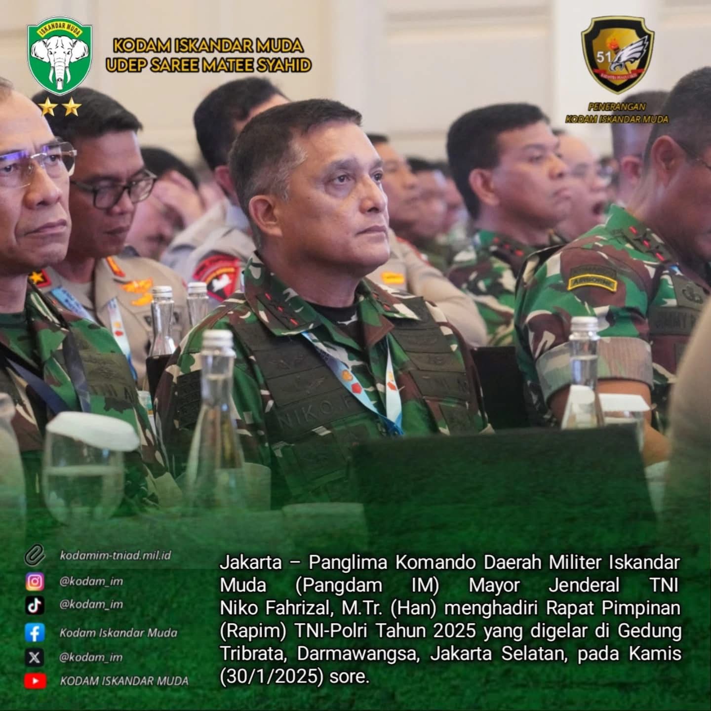 Jakarta – Panglima Komando Daerah Militer Iskandar Muda (Pangdam IM) Mayor Jenderal TNI Niko Fahrizal, M.Tr. (Han) menghadiri Rapat Pimpinan (Rapim) TNI-Polri Tahun 2025 yang digelar di Gedung Tribrata, Darmawangsa, Jakarta Selatan, pada Kamis (30/1/2025) sore.