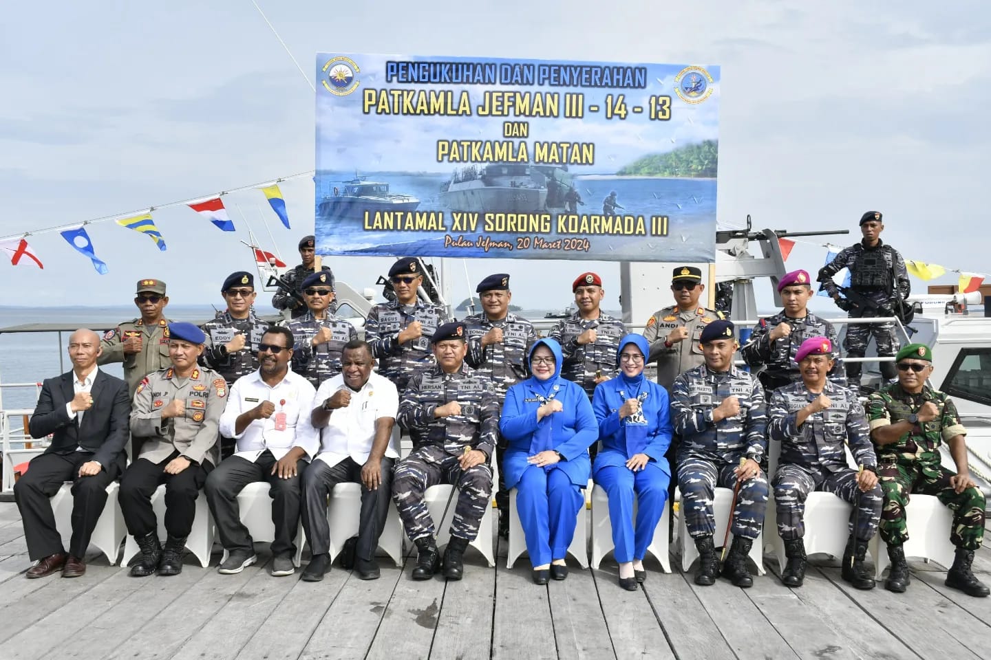 Jefman Raja Ampat(21/03/24) – Panglima Komando Armada (Pangkoarmada III) Laksamana Muda TNI Hersan, S.H., M.Si., M.Tr. Opsla, yang didampingi Ketua Daerah Jalasenastri Armada III Ny Dita Hersan, memimpin upacara pengukuhan dan penyerahan Patkamla Jefman dan Patkamla Matan di Lantamal XIV, Sorong, Papua Barat Daya, Rabu (20/03).