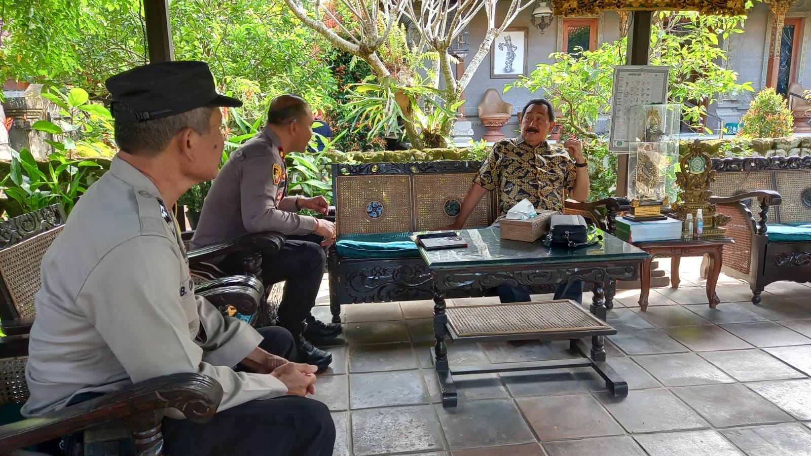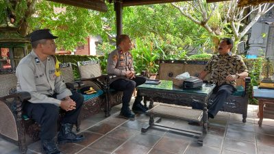 Kepala Kepolisian Sektor Mengwi Kompol I Ketut Adnyana T.J S.Sos.,S.H.,M.M., didampingi Bhabinkamtibmas Desa Mengwi Aiptu Ida Bagus Oka Darma Putra melaksanakan koordinasi kamtibmas dengan penglingsir Puri Ageng Mengwi Anak Agung Gede Agung, S.H.