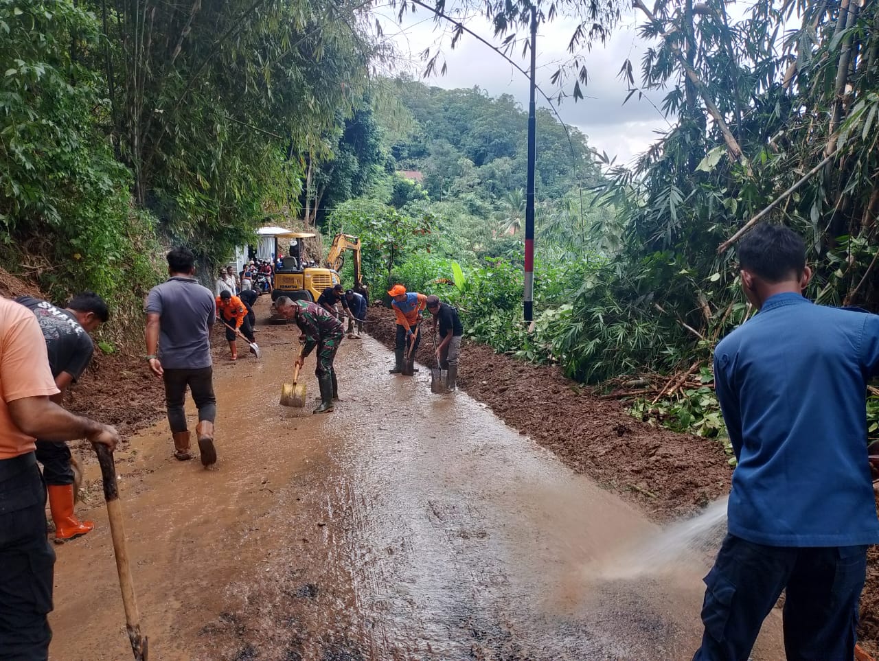 Majalengka || Rumpun bambu dan material tanah longsor yang menutupi jalan utama penghubung Desa Sindangpano dan Desa Payung Kecamatan Rajagaluh, Kabupaten Majalengka mulai dibersihkan tim gabungan.