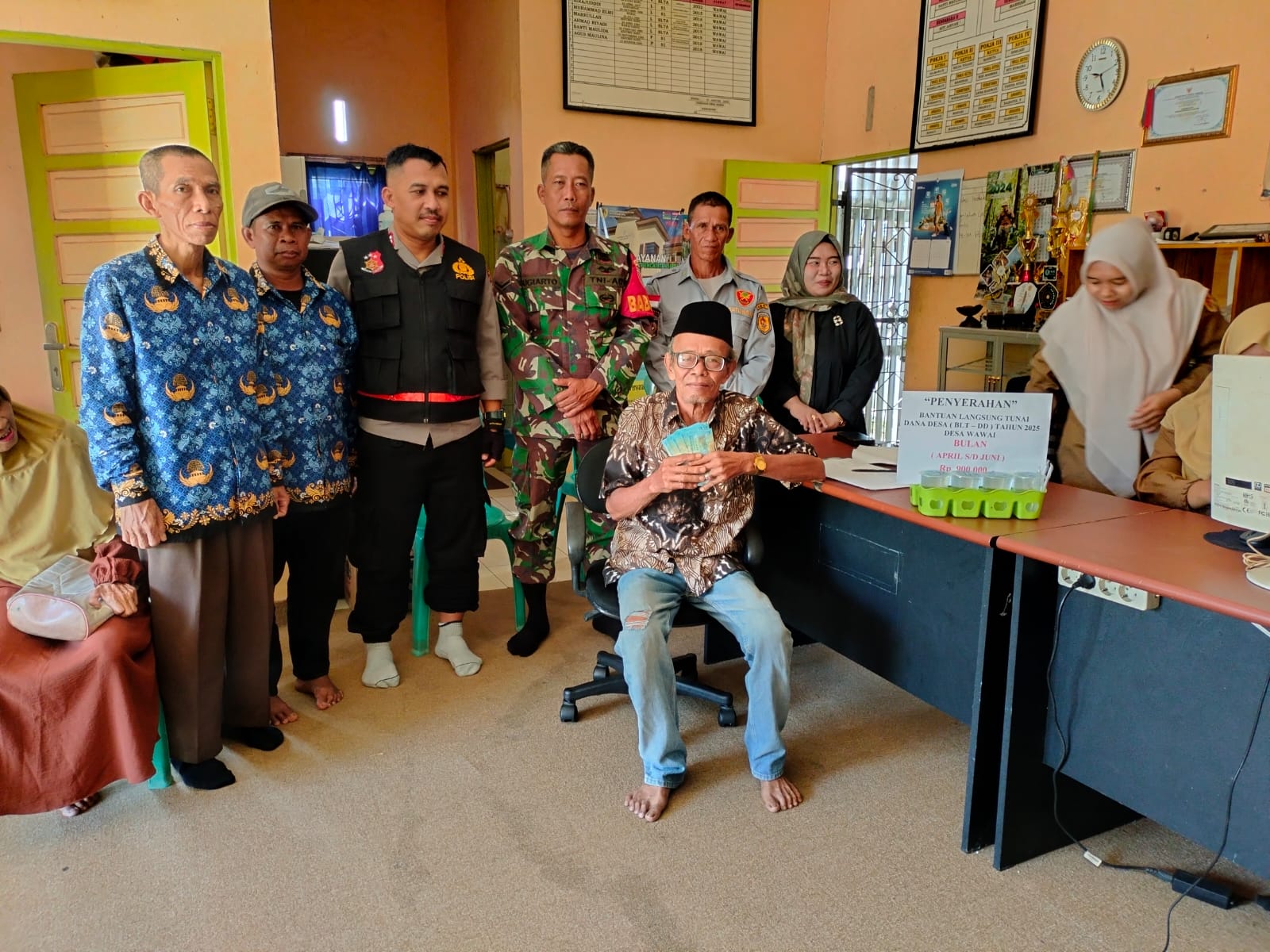 BARABAI,Sertu Sugiarto, seorang Babinsa dari Koramil 1002-01/Batang Alai Selatan, bersama Bhabinkamtibmas Polsek Batang Alai Selatan, bersinergi mendampingi proses penyaluran Bantuan Langsung Tunai (BLT) di Desa Wawai, Kecamatan Batang Alai Selatan, Kabupaten Hulu Sungai Tengah.Kamis (19/6).