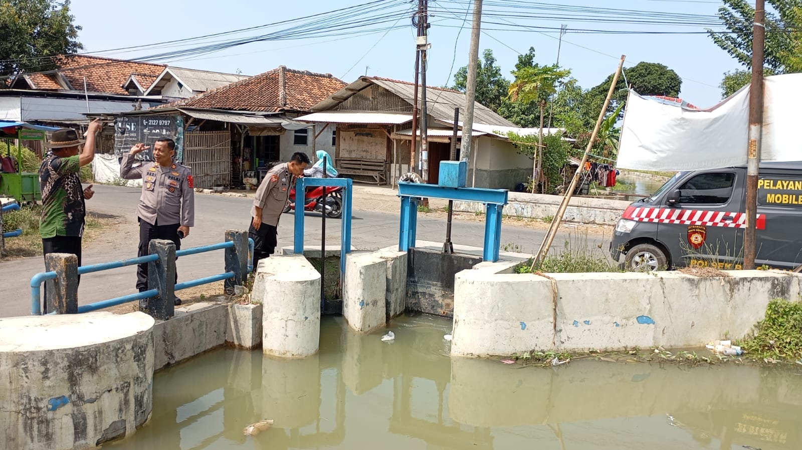 Indramayu – Kapolsek Balongan, Polres Indramayu Polda Jabar, AKP Dedi Wahyudi, S.H., bersama Kasium Aipda Casboni, Bhabinkamtibmas Bripka Dirah, dan Raksa Bumi Amin, melaksanakan patroli gilir giring air di Pintu Air Talam di Desa Sudimampir Lor, Kecamatan Balongan, Kabupaten Indramayu, dalam rangka memastikan distribusi air berjalan lancar dan mencukupi bagi area persawahan. Kamis (5/9/2024)