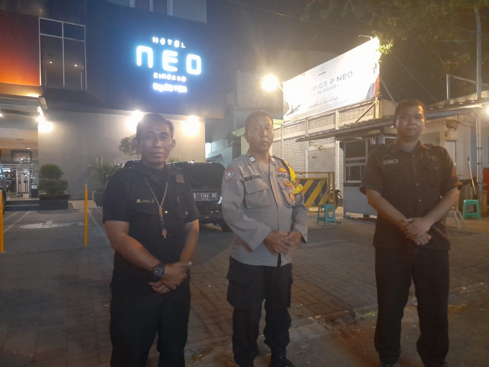 POLRES CIREBON KOTA -, Aiptu Imam Safei selaku anggota Bhabinkamtibmas Kelurahan Kesenden Polsek utbar Polres Cirebon kota bersama Babinsa sambang patroli wilayah binaan menyambangi di petugas satpam hotel Neo di jalan Samadikun Kelurahan Kesenden Kecamatan Kejaksan Cirebon Kota, Minggu malam (08/09/2024).