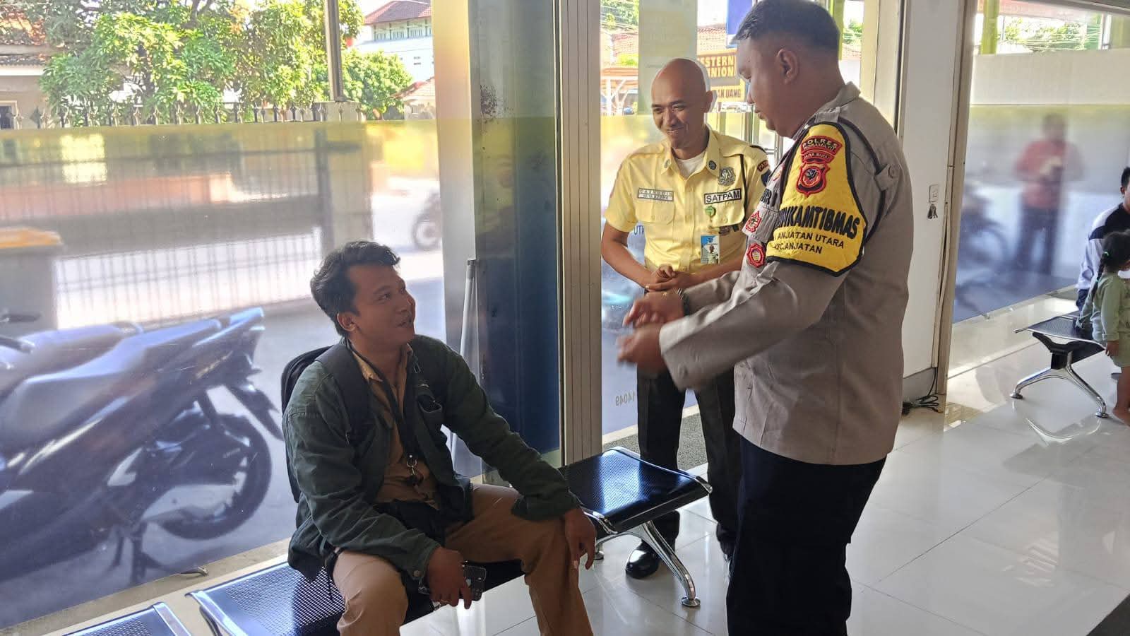 Seperti yang terlihat personel Polsek Anjatan melakukan dialog di depan kantor BRI Unit Anjatan.