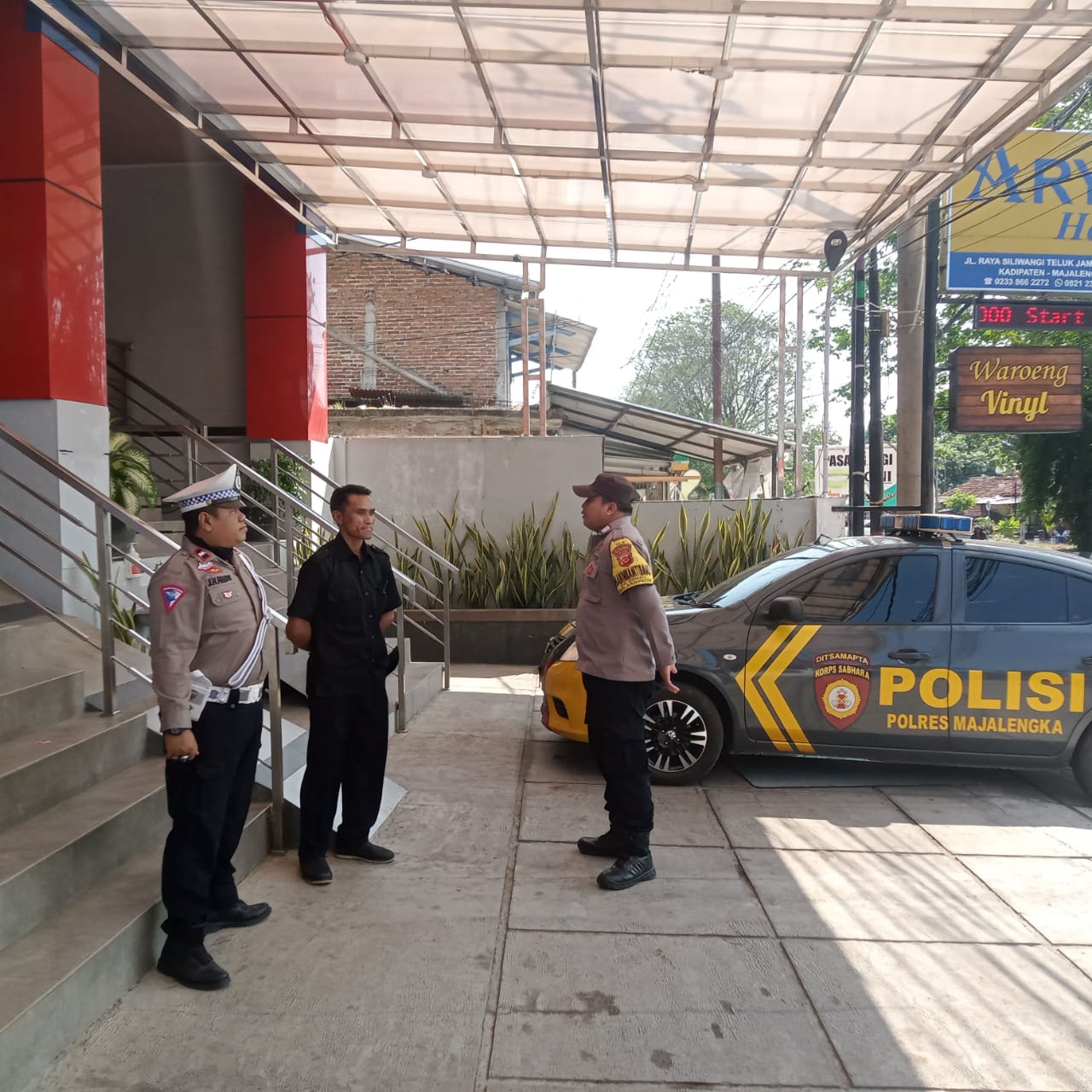 Majalengka -Dalam rangka meningkatkan kesadaran dan kesiapsiagaan keamanan, personel Polsek Kadipaten Polres Majalengka Polda Jabar, Aipda Johan Heru Prabowo, S.H., dan Bripka Bib Abi Musyadat, melaksanakan patroli siang ke Hotel Arya. Kegiatan tersebut bertujuan untuk mensosialisasikan call center 110 kepada satpam yang bertugas di hotel tersebut. Minggu (