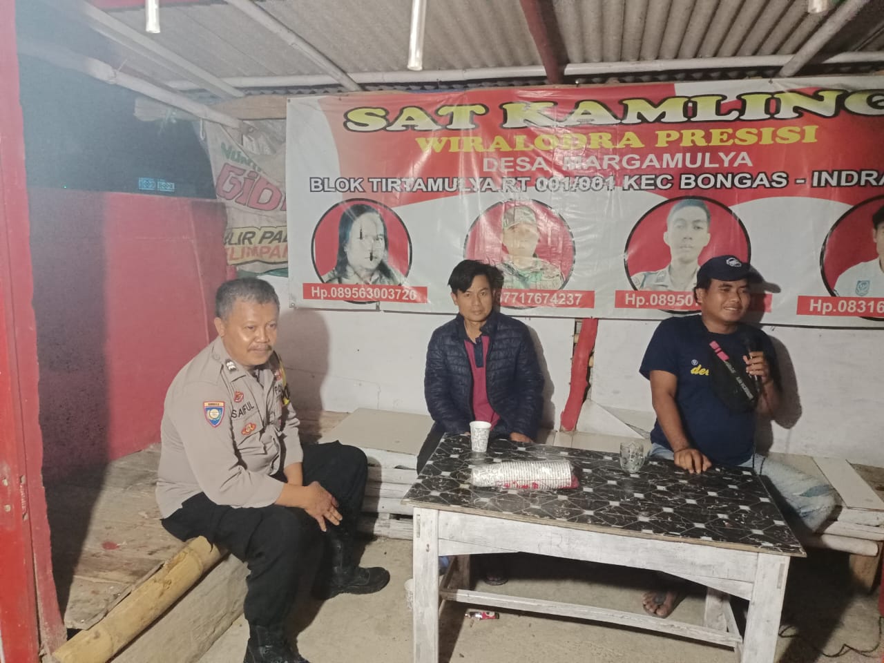 Indramayu – Bhabinkamtibmas Polsek Bongas, mengajak warga untuk aktif dalam kegiatan Satuan Keamanan Lingkungan (Satkamling).