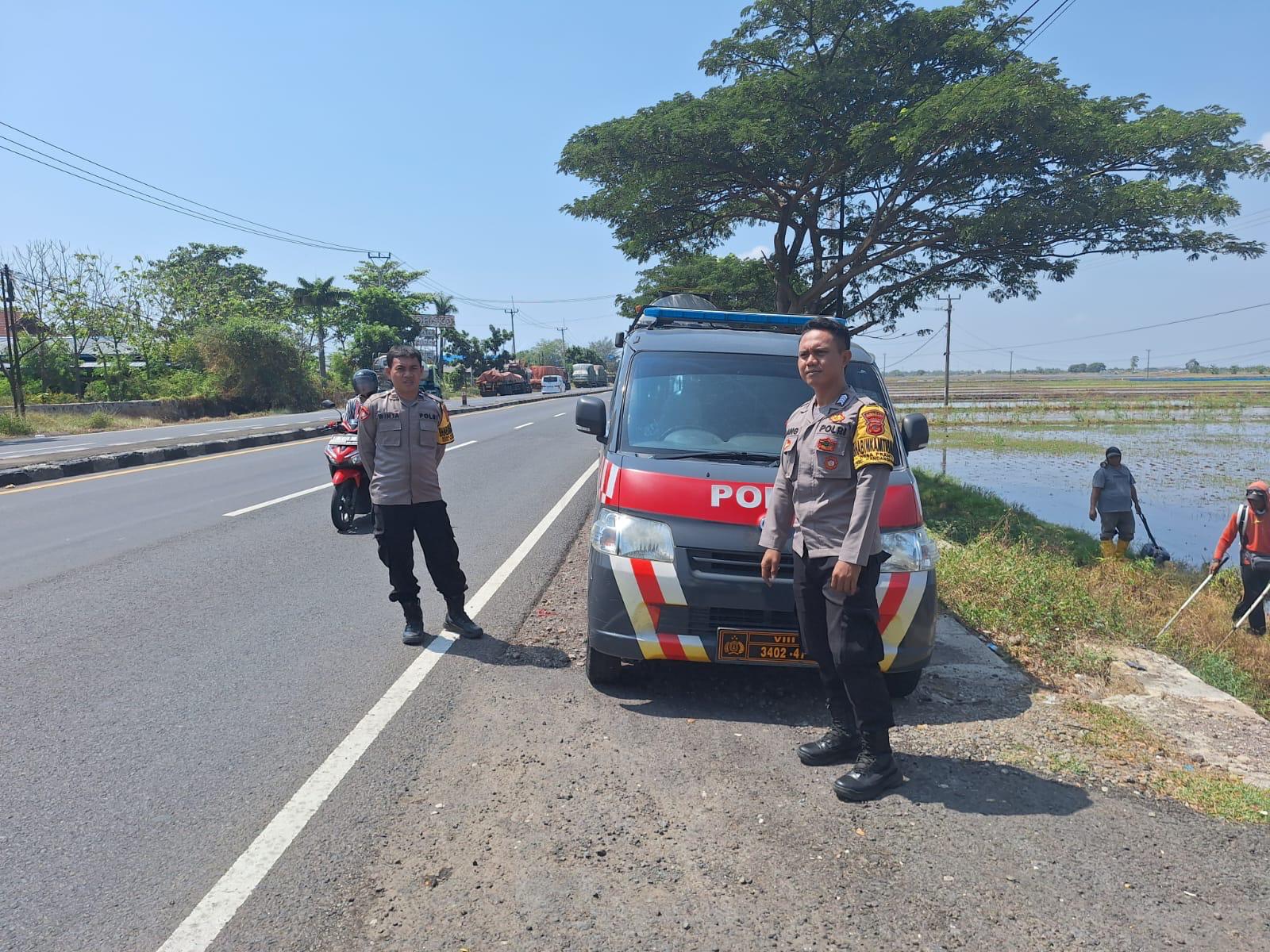 Indramayu — Menjelang petang, dua personel Polsek Kandanghaur Polres Indramayu Polda Jabar tampak siaga di tepi jalan raya dengan kendaraan dinas terparkir menyala. Sabtu (23/8/2025).