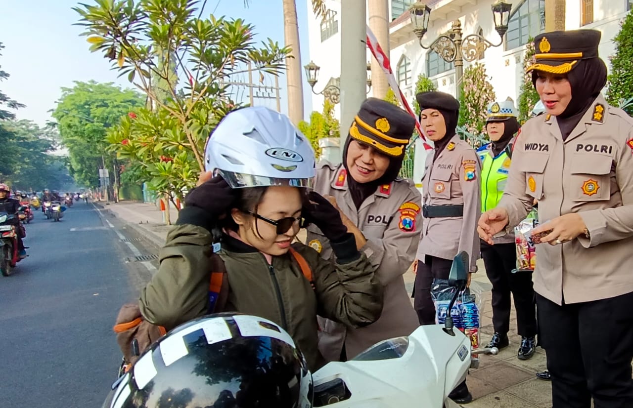 Bukan hanya mengatur lalu lintas, namun para Polwan Polda Jatim juga memberikan hem gratis bagi pengendara yang kedapatan tidak menggunakannya.