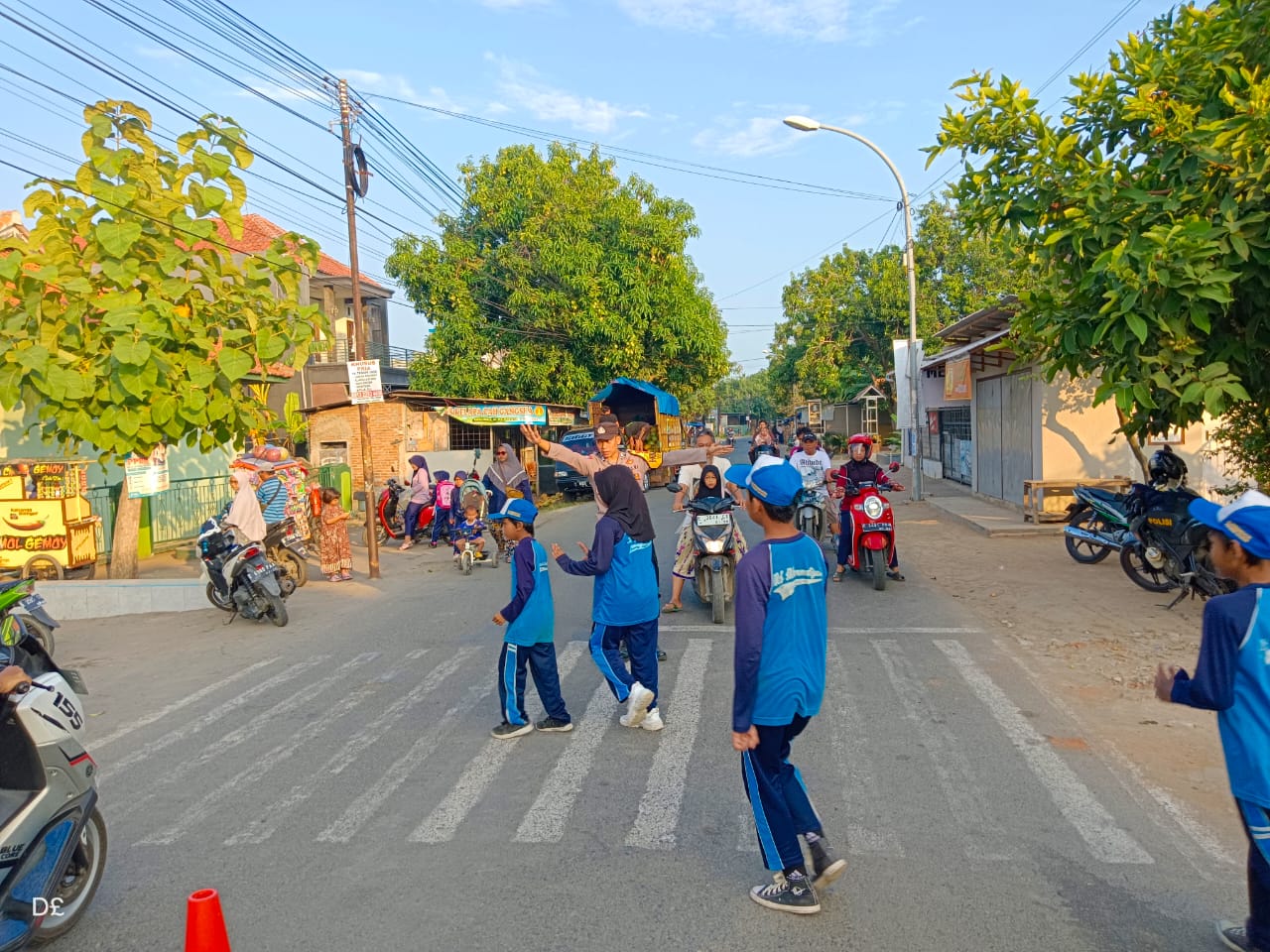 Indramayu – Bhabinkamtibmas Polsek Balongan, jajaran Polres Indramayu Polda Jabar, melakukan aksi mulia dengan membantu para pelajar menyeberang jalan di jalan raya depan MI MDA Muhammadiyah Tegalurung, Kecamatan Balongan, Kabupaten Indramayu, pada Sabtu (3/8/2024).