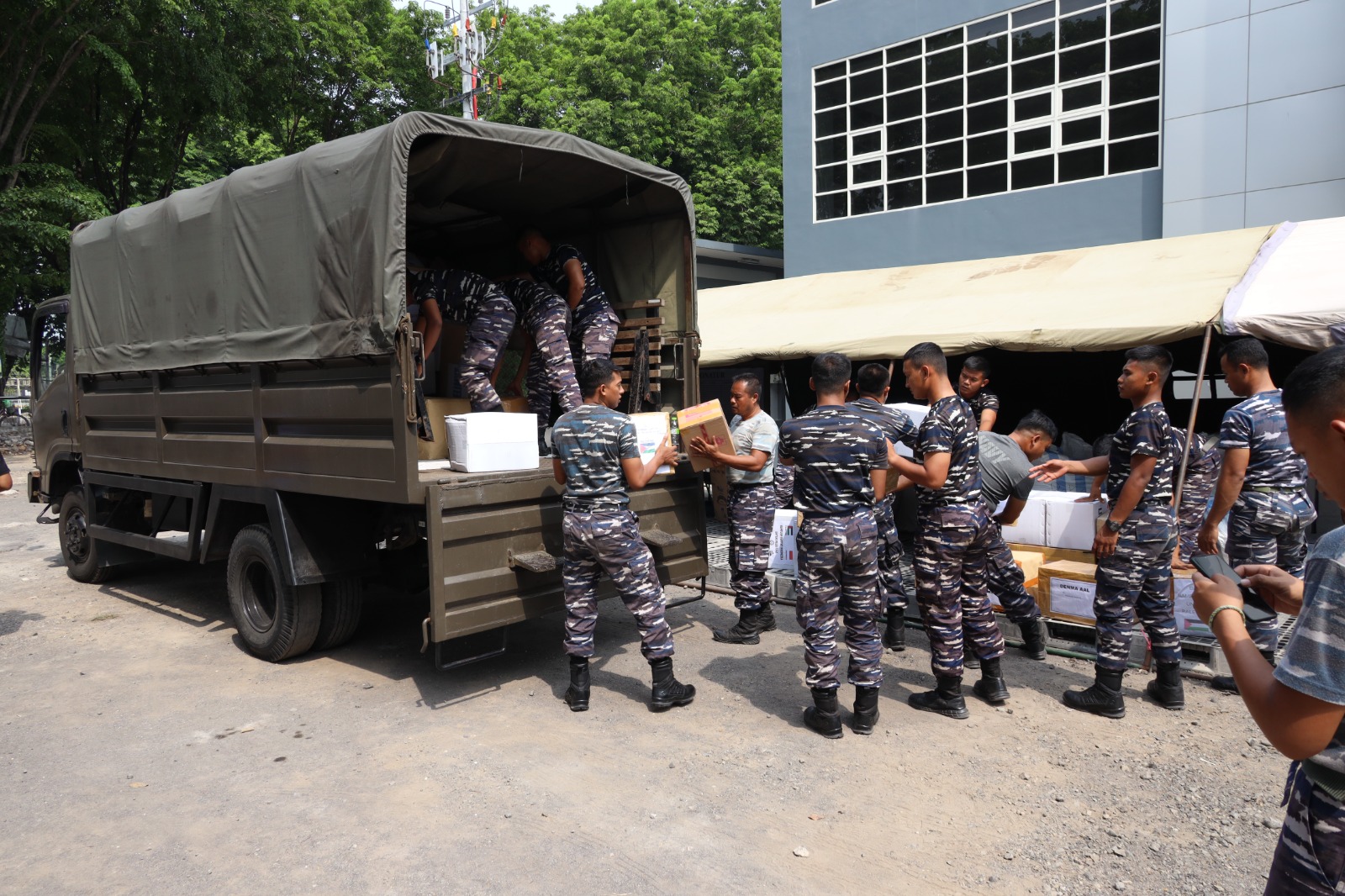 Akademi TNI Angkatan Laut (AAL) salurkan bantuan sosial untuk mendukung masyarakat Palestina melalui TNI Angkatan Laut Peduli kepada masyarakat Gaza Palestina yang bertempat di Spotmar Koarmada II, Ujung Surabaya, Rabu (17/11/2023).