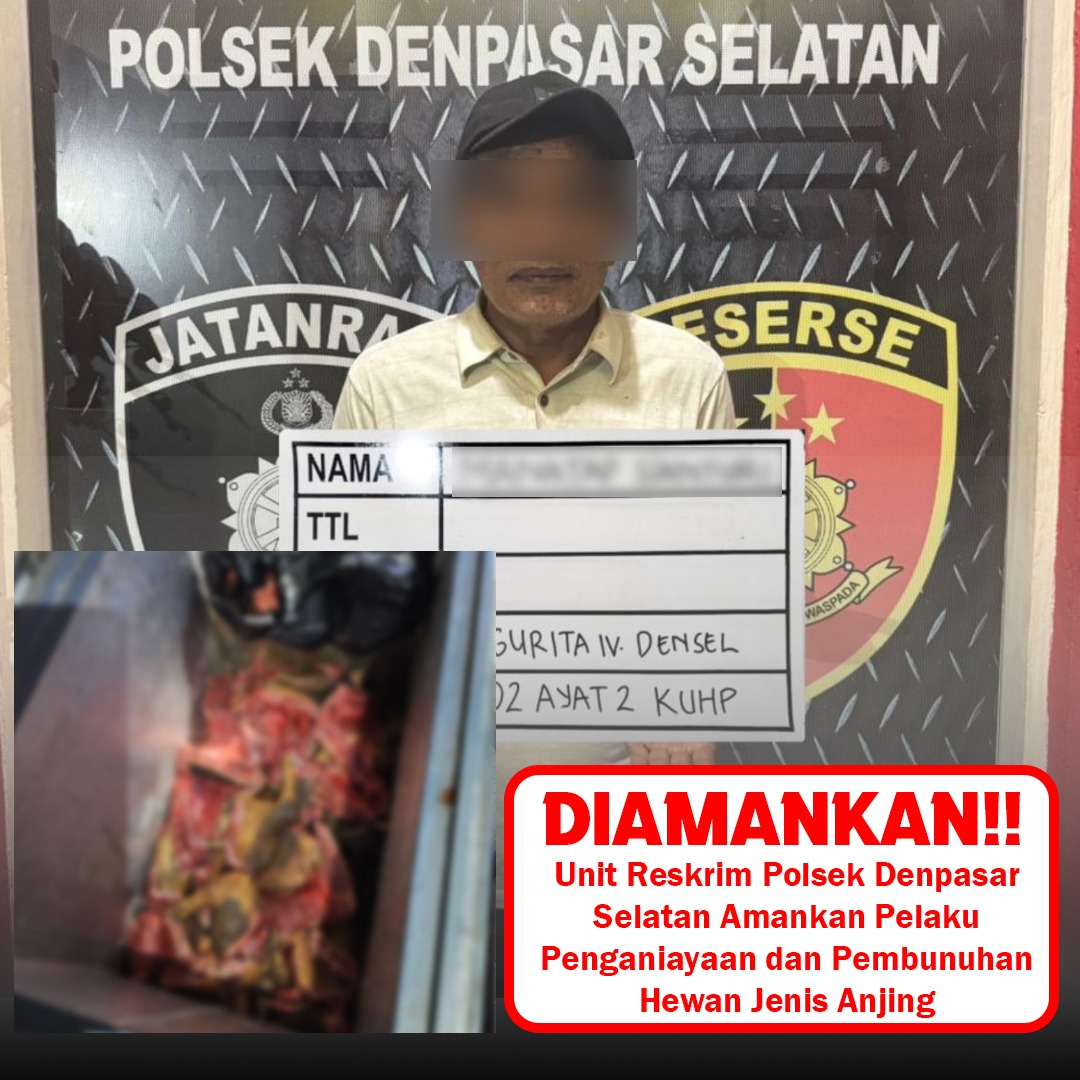 Polsek Denpasar Selatan mengamankan seorang pria bernama MS (62) asal Tapanuli Utara yang diduga telah melakukan penganiayaan dan pembunuhan hewan jenis anjing yang kemudian diolah menjadi makanan untuk dijual.