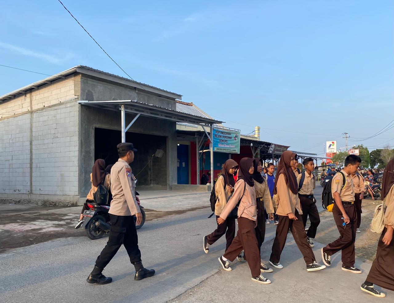 Indramayu,– Anggota Polsek Bongas jajaran Polres Indramayu Polda Jabar melakukan pengaturan lalu lintas pagi, membantu masyarakat yang hendak menyebarang jalan.