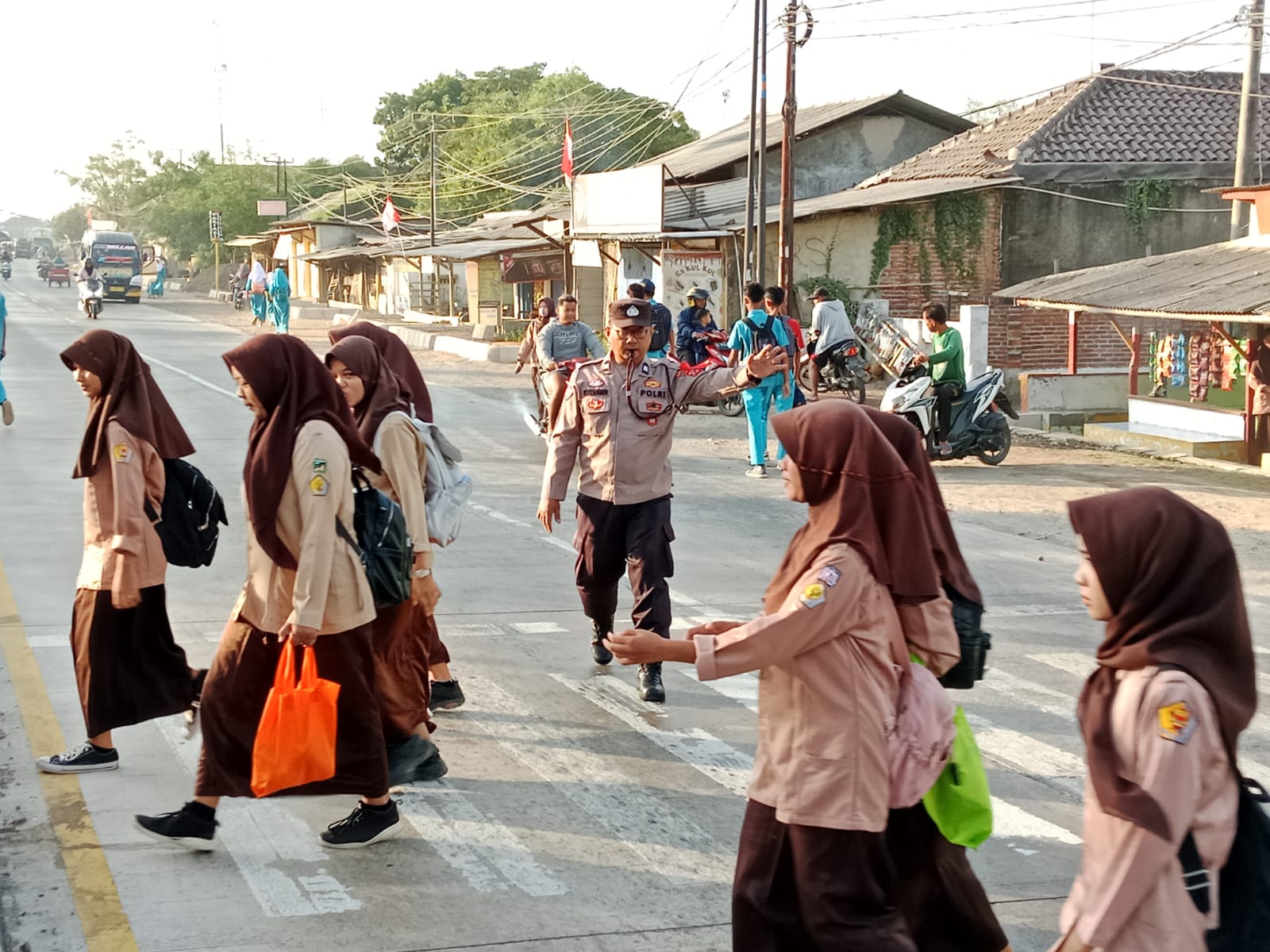 Pelayanan Prima, Polsek Kandanghaur Indramayu Bantu Pelajar Menyebrang Jalan
