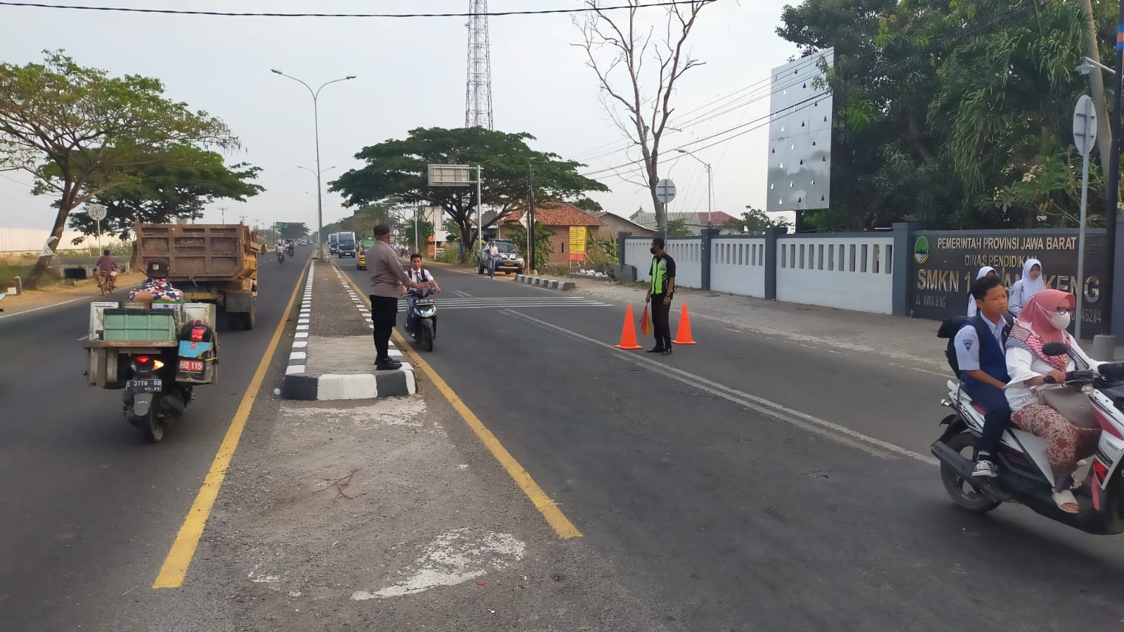 Indramayu, – Polsek Krangkeng jajaran Polres Indramayu Polda Jabar terus menerapkan pelayanan prima dengan melaksanakan pengaturan lalu lintas di titik-titik rawan laka dan rawan kemacetan di sekitar jalan Raya Krangkeng, khususnya di area SMKN 1 Krangkeng, Kecamatan Krangkeng, Kabupaten Indramayu, Selasa (19/9/2023)