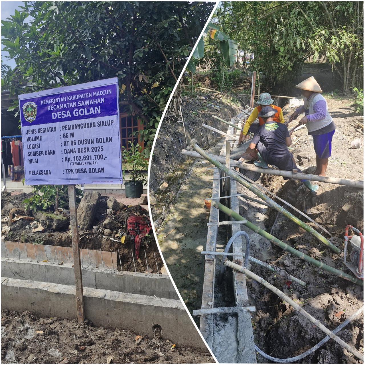 Mengingat sangat pentingnya saluran irigasi, untuk memastikan saluran air dapat berjalan dengan lancar pemerintah Desa Golan melalui dana yang bersumber dari dana desa Tahun 2025 senilai Rp. 102.691.700 , desa mengalokasikan anggarannya untuk pembangunan saluran irigasi yang terletak di Rt 06 desa Golan kecamatan sawahan kabupaten madiun dengan volume 66 Meter.