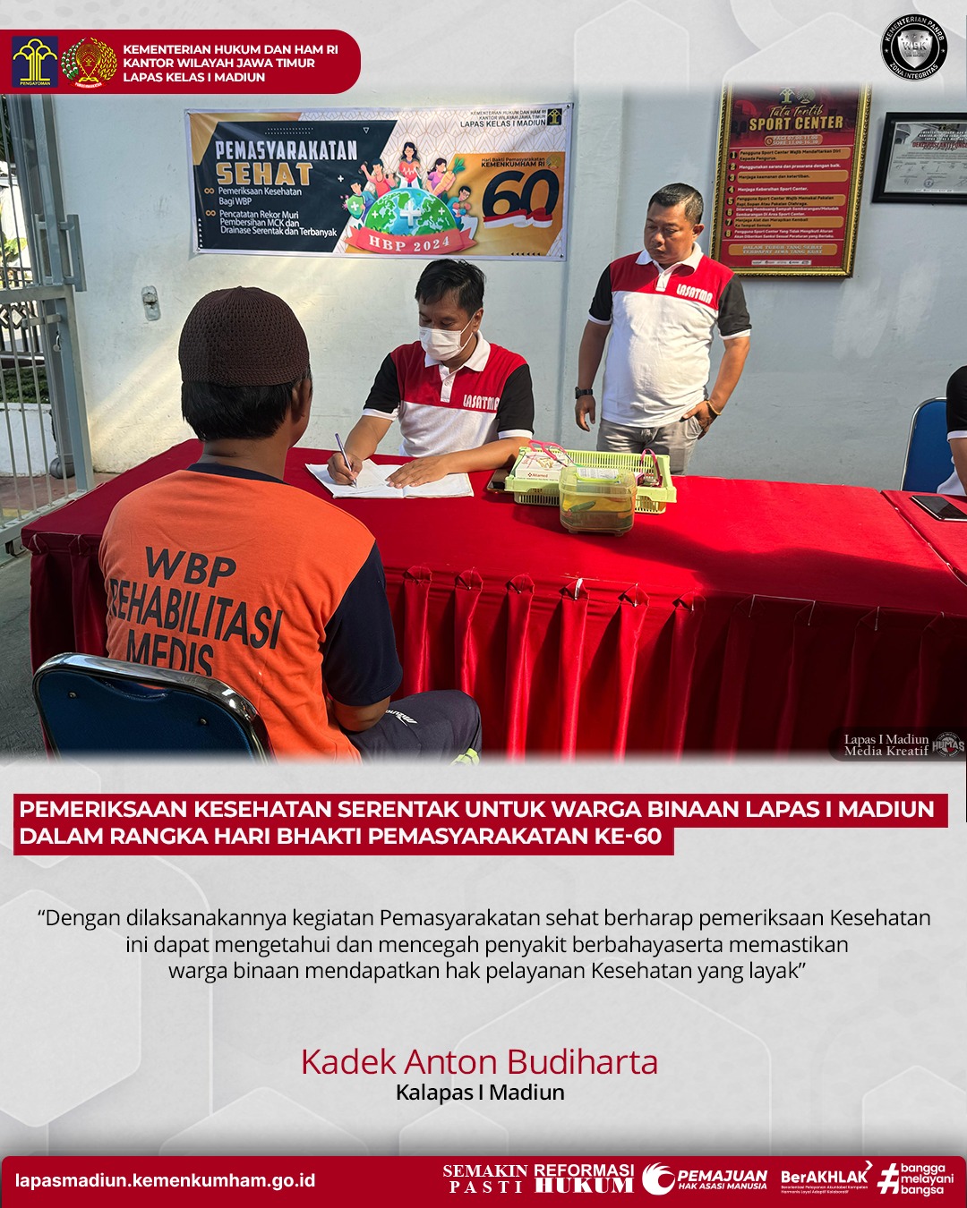 MADIUN,BUSERJATIM.COM GROUP – Dalam rangka memperingati Hari Bhakti Pemasyarakatan ke-60 tahun 2024, Lembaga Pemasyarakatan Kelas I Madiun Kanwil Kemenkumham Jatim menggelar kegiatan pemeriksaan kesehatan serentak bagi Warga Binaan Pemasyarakatan, Jum’at (19/04).