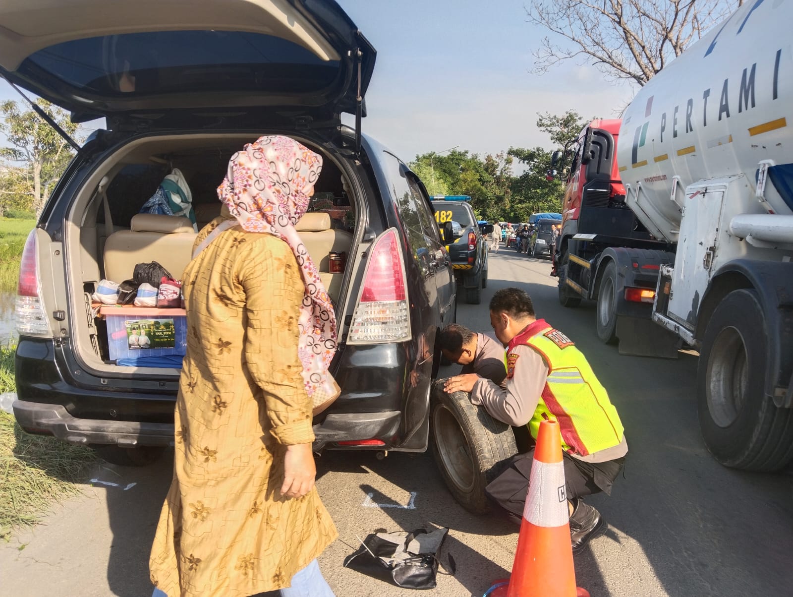 Keadaan semakin rumit karena pemudik tersebut tidak membawa ban serep untuk mengganti ban yang rusak.