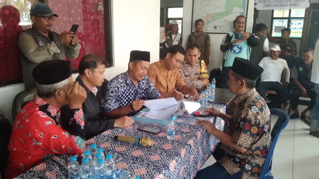 Indramayu,– Proses pendaftaran bakal calon kepala desa (kuwu) Desa Pabean Udik, Kecamatan dan Kabupaten Indramayu, berlangsung meriah dan kondusif, Kamis (9/10/2025).