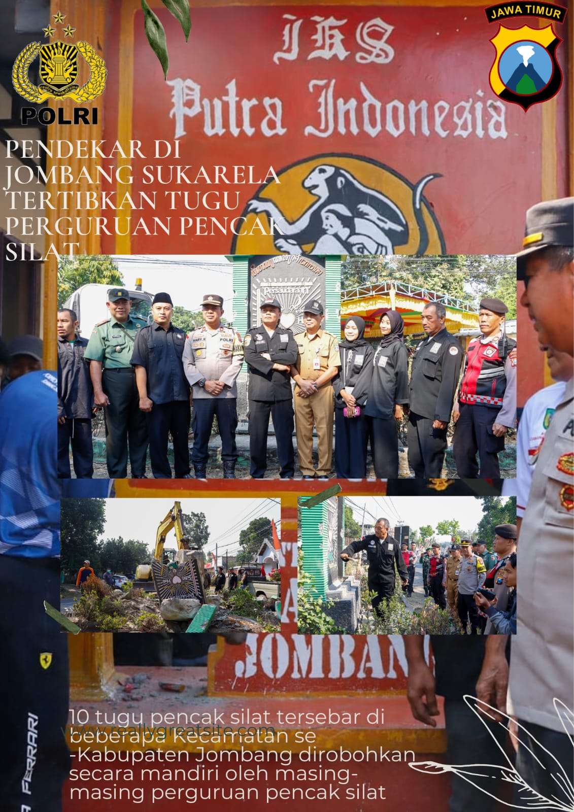 Hari ini, Selasa (5/9/2023) ada sekitar 10 tugu pencak silat tersebar di beberapa Kecamatan se -Kabupaten Jombang dirobohkan secara mandiri oleh masing-masing perguruan pencak silat didampingi petugas dari Polres Jombang, Kodim 0814, Kejari, serta dinas/instansi Pemkab Jombang.