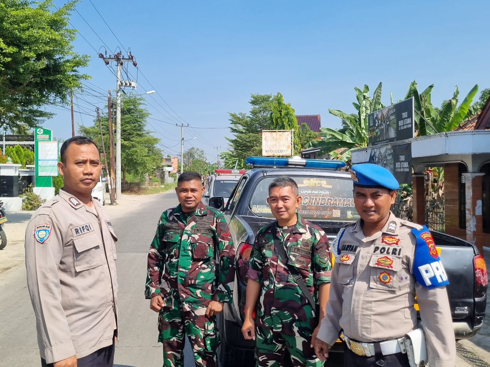 Empat personel berseragam lengkap dua dari TNI dan dua dari Polri terlihat berdiri berdampingan di depan kendaraan dinas polisi, menandai kekompakan dalam menjaga keamanan wilayah.