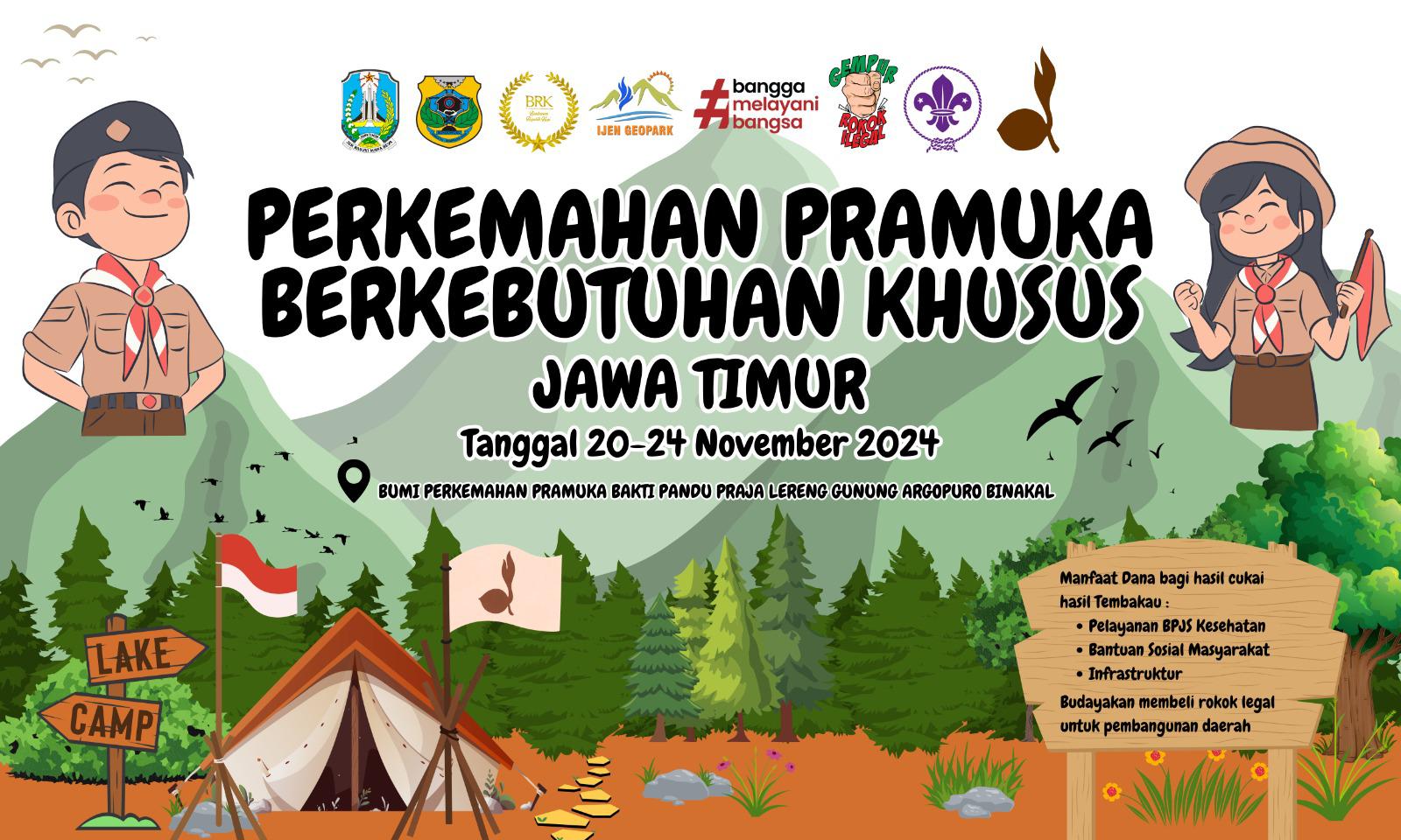 Bondowoso. – Dalam semangat inklusivitas dan pendidikan karakter, Perkemahan Pramuka Berkebutuhan Khusus Jawa Timur digelar pada 20–24 November 2024 di Bumi Perkemahan Pramuka Bakti Pandu Praja, Lereng Gunung Argopuro, Binakal, Bondowoso. Kegiatan ini mengusung tema “Membangun Kepedulian, Kesetaraan, dan Kemandirian Pramuka Inklusif”.