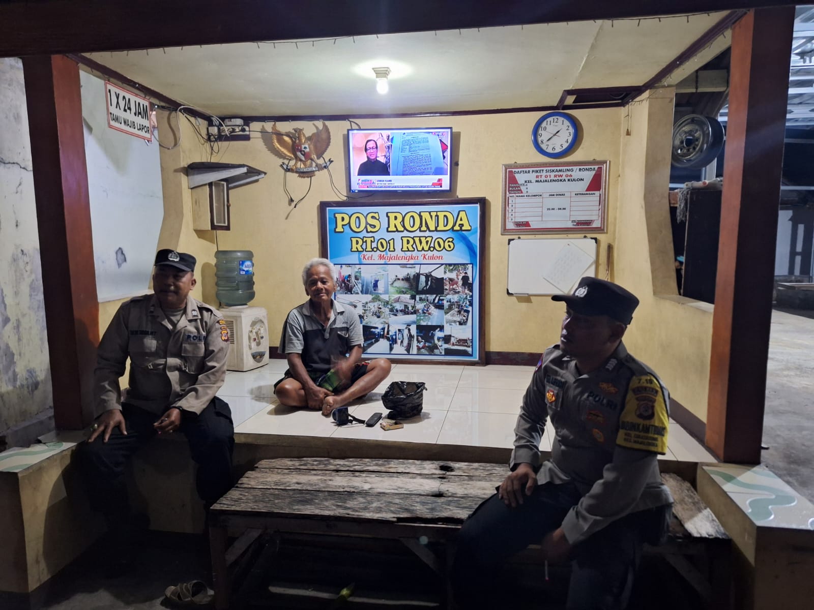 Majalengka – Personel Polsek Majalengka Kota, Polres Majalengka, Polda Jawa Barat, Aiptu Deni Sudrajat bersama Bripka Heri Supriadi, menyambangi pos Sat Kamling di wilayah Kelurahan Majalengka Kulon, Kecamatan Majalengka, Kabupaten Majalengka pada Senin (1/7/2024) dini hari. Kegiatan ini bertujuan untuk memberikan pesan-pesan Kamtibmas (Keamanan dan Ketertiban Masyarakat) kepada warga setempat.