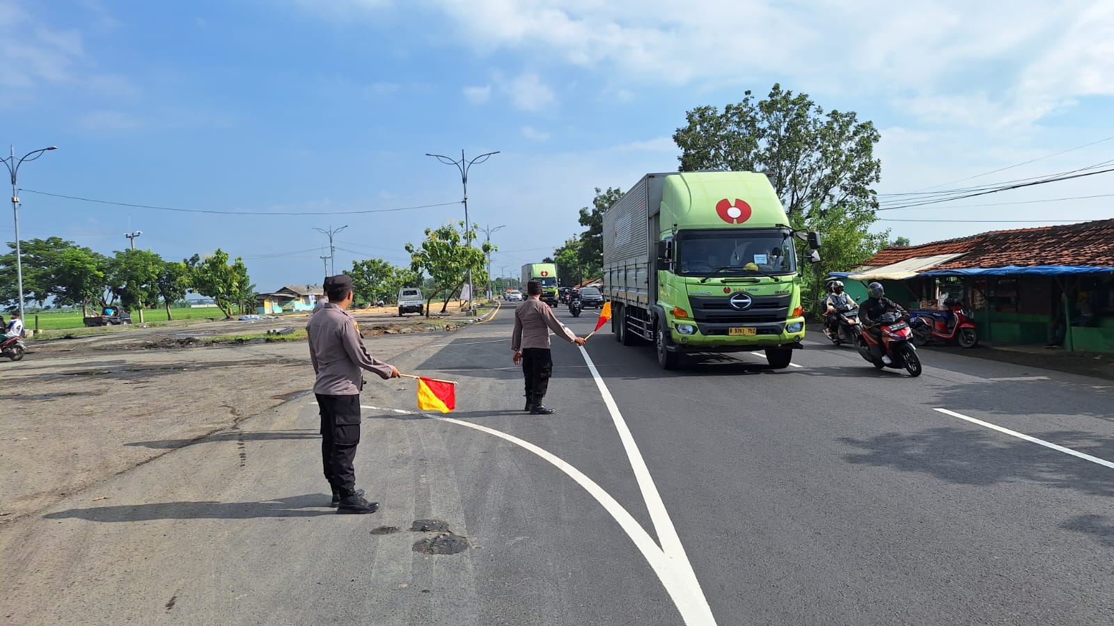 Indramayu,- Personil pengamanan Ops Ketupat Lodaya 2024 Polres Indramayu Polda Jabar melakukan pengaturan lalu lintas di jalur pantura Cadangpinggan, yang merupakan wilayah hukum Polsek Sukagumiwang. Minggu pagi (7/4/2024)