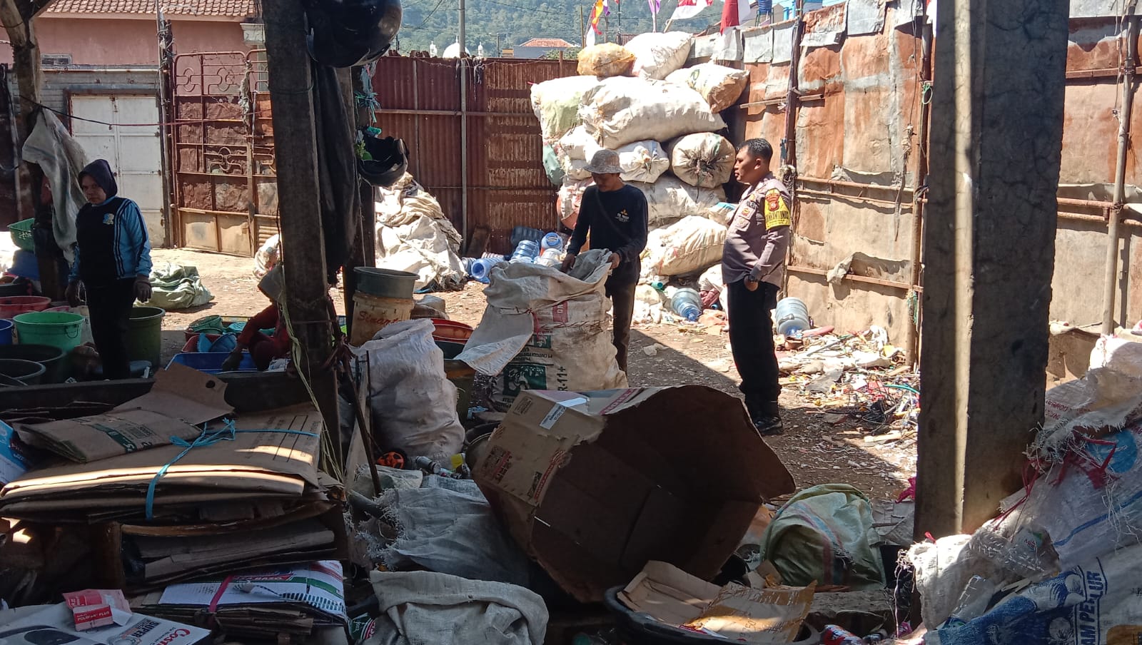 Majalengka – Panit Binmas Polsek Cikijing Polres Majalengka Polda Jabar IPDA Brigmono R, S.H, Ps. Kasie Humas Bripka Deby dan Bhabinkamtibmas Bripka Dede Arif menyambangi gudang barang bekas milik Bapak H. Aang di Desa Sindangpanji, Kecamatan Cikijing, Kabupaten Majalengka, guna menyampaikan pesan-pesan Kamtibmas. Rabu (02/08/2023).