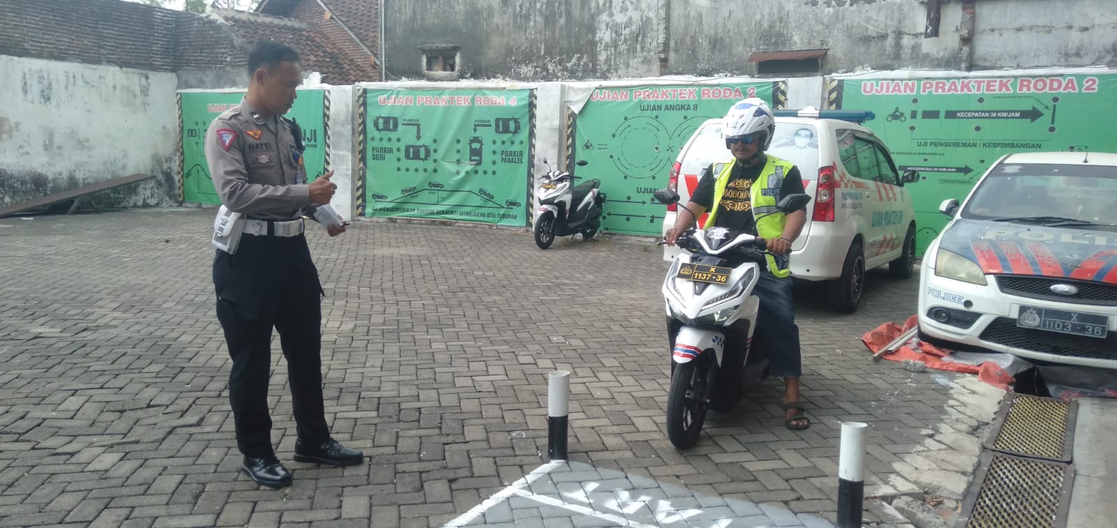 “Materi pertama yang diujikan adalah tentang pengereman, selanjutnya peserta ujian diharuskan melakukan putar balik, serta materi ketiga tentang keseimbangan, di mana peserta diuji dalam menggambar huruf S lalu materi terakhir terkait reaksi atau menggambar huruf Y yang harus mengikuti intruksi dari penguji,” jelas AKP Pandri