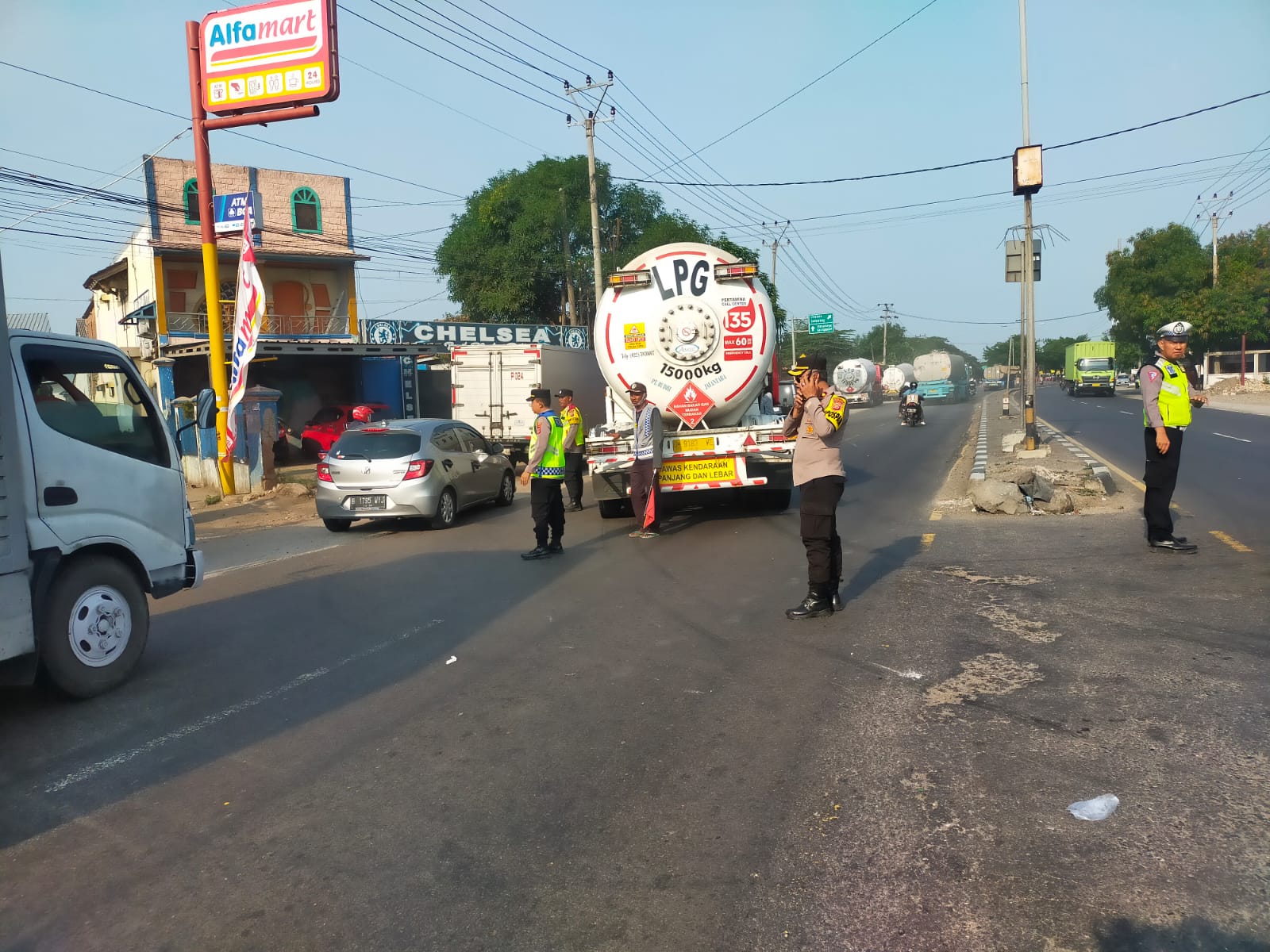 Indramayu, – Petugas Pos Pengamanan Lingkar Lohbener, yang dipimpin oleh Kapospam Kompol H. Nurani, S.M, serta didukung oleh Padal Ipda Hadiyanto, S.H., melakukan pengaturan lalu lintas dan evakuasi mobil elpiji yang mengalami mogok melintang di tengah jalan.