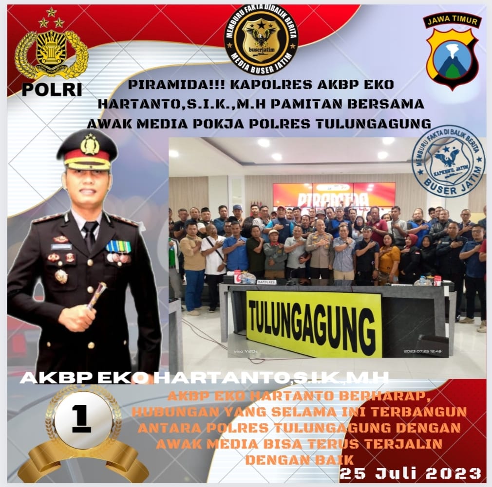 AKBP Eko Hartanto, di hadapan awak media yang hadir dalam kegiatan Silaturahmi (Piramida) di gedung SAR Mapolres Tulungagung. Kapolres bersama Awak Media mengatakan, secara resmi dirinya menjabat selama 1 tahun lebih dua minggu di Mapolres Tulungagung. Selanjutnya putra Kabupaten Pati, Jawa Tengah tersebut akan bertugas menjadi Kabagbinkar Ro SDM Polda Sumut. Selasa, 25/7/2023.