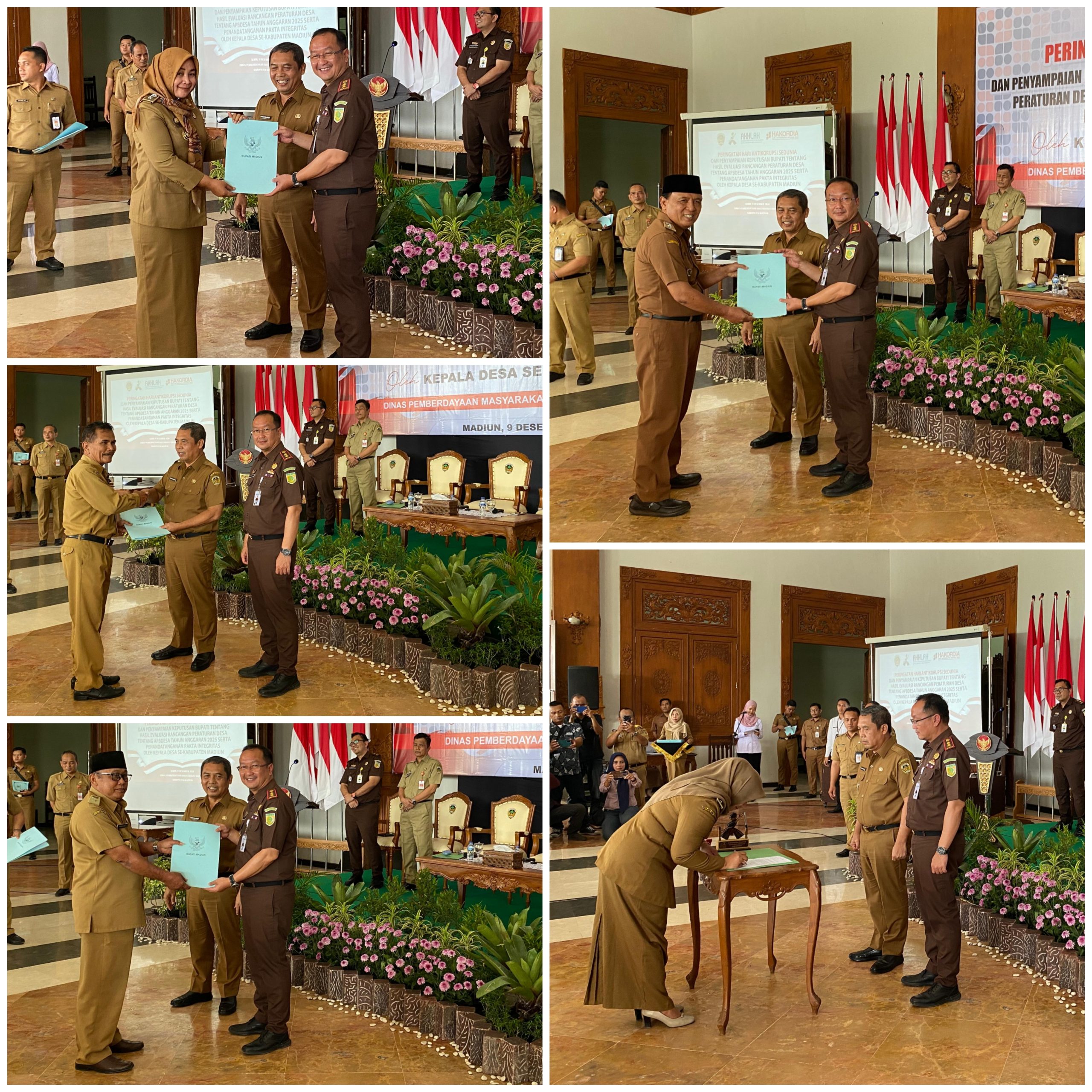 MADIUN, BUSERJATIM.COM – Bertempat di pendopo Ronggo Jumeno Kabupaten madiun pada senin (9/12) pagi telah di laksanakan peringatan hari anti korupsi sedunia dan pembacaan keputusan bupati madiun tentang hasil evaluasi rancangan peraturan desa tentang APB Des Tahun anggaran 2025 dan penandatangan pakta integritas oleh kepala desa se – Kabupaten madiun.