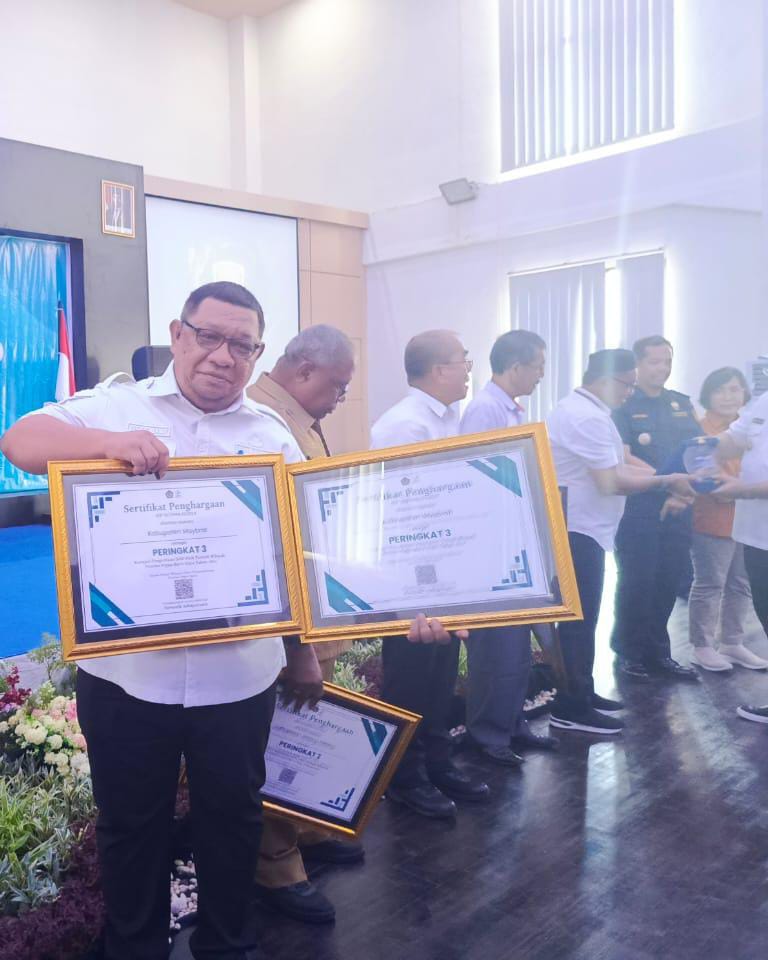 SORONG PBD, BUSERJATIM.COM GROUP – Pemerintah Kabupaten Maybrat baru-baru ini mencatatkan prestasi gemilang dengan berhasil meraih dua penghargaan bergengsi. Penjabat (Pj) Bupati Maybrat, Vicente.C.Baay, S.IP, menerima dua sertifikat penghargaan dalam kategori yang berbeda. Penghargaan pertama adalah peringkat ketiga dalam kategori Pengelolaan Dana Alokasi Khusus (DAK) terbaik wilayah Provinsi Papua Barat Daya Tahun 2024, dan penghargaan kedua adalah peringkat ketiga dalam kategori Pengelolaan Dana Desa terbaik untuk wilayah yang sama.