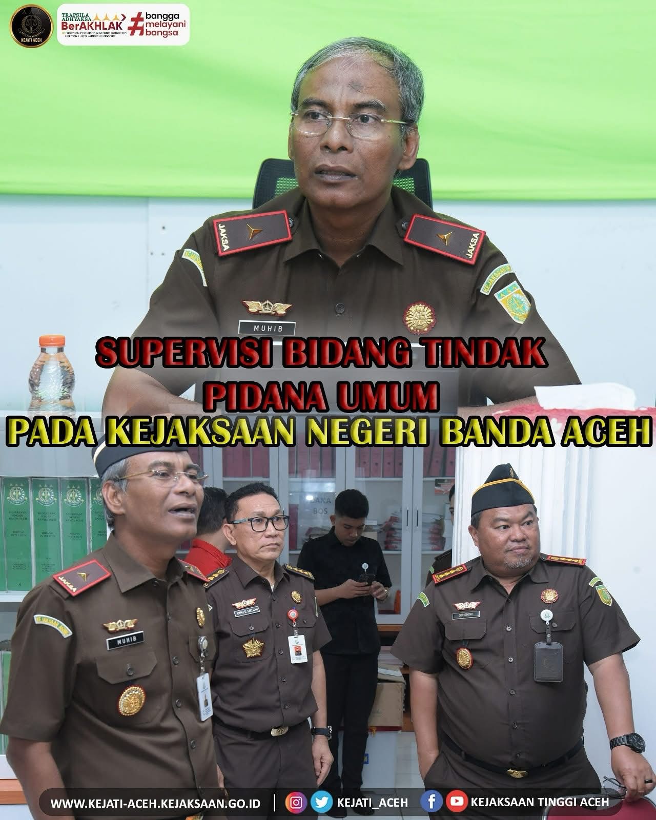 Banda Aceh, 9 Januari 2025 – Pelaksana tugas (Plt.) Kepala Kejaksaan Tinggi (Kejati) Aceh, Muhibuddin, S.H., M.H., didampingi Asisten Bidang Tindak Pidana Umum, Amru Eryandi Siregar, S.H., M.H., melakukan kunjungan kerja ke Kantor Kejaksaan Negeri (Kejari) Banda Aceh. Kunjungan ini bertujuan untuk melaksanakan supervisi khusus terhadap Bidang Tindak Pidana Umum di Kejari Banda Aceh.