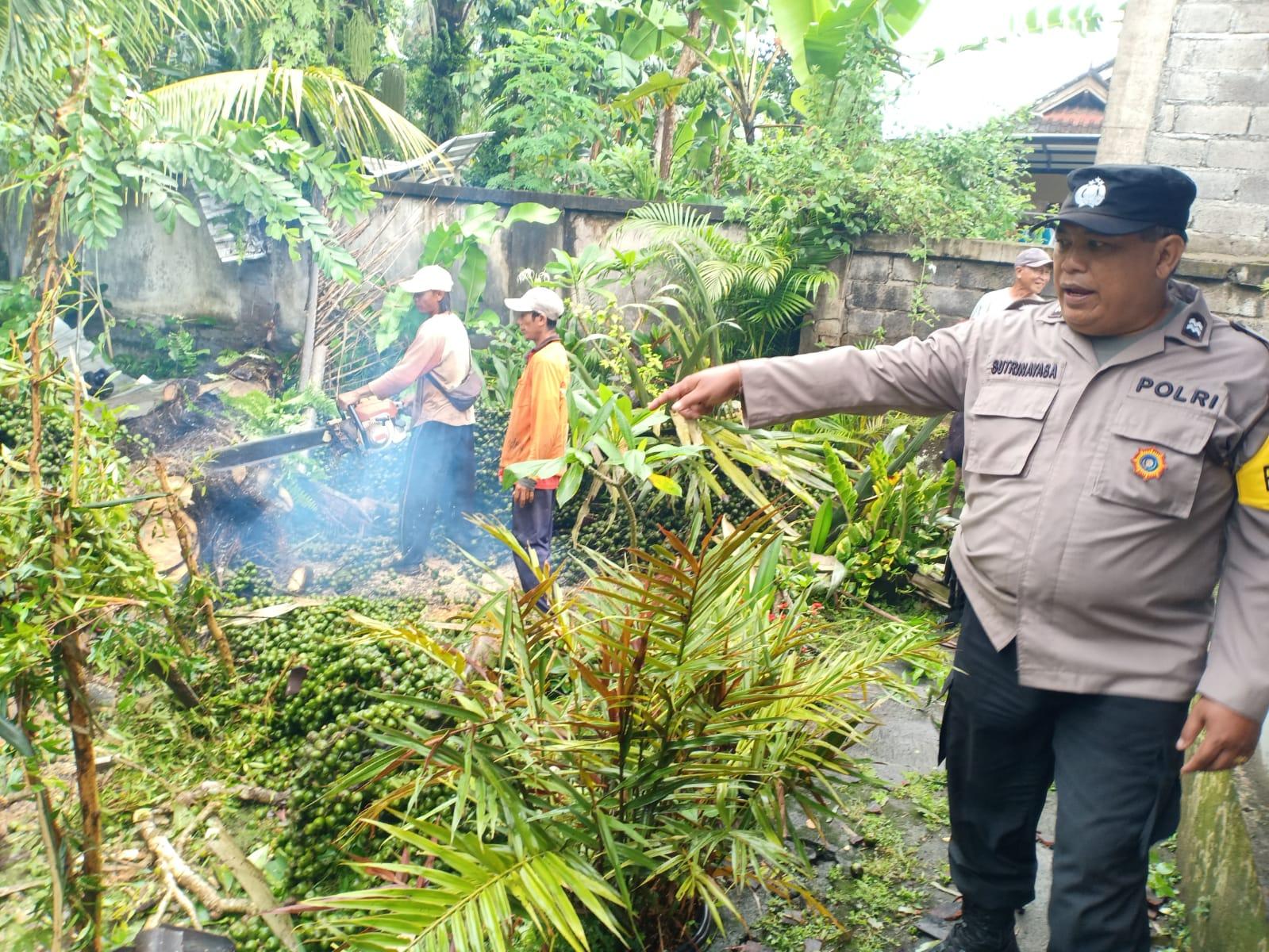 Bhabinkamtibmas bersama masyarakat secara gotong royong dengan memangkas ranting dan memotong batang pohon enau dengan mendatangkan tukang sensor kayu secara pribadi. Akibat dari pohon tumbang tersebut pemilik rumah mengalami kerugian materiil (Kerusakan bangunan) sebesar Rp.5.000.000 (Lima Juta Rupiah). Serta tidak menimbulkan korban jiwa.
