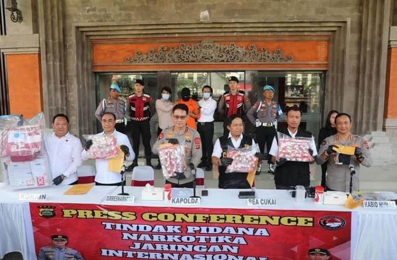 DENPASAR, BUSERJATIM.COM – Saat Konferensi Pers di depan para awak media bertempat di Loby Mapolda Bali, Kapolda Bali Irjen Pol Daniel Adityajaya S.H., S.I.K., M.Si., didampingi Kabid Humas Kombes Pol Ariasandy S.I.K dan Diresnarkoba Kombes Pol Radiant S.I.K., M.Hum., serta perwakilan dari Bea Cukai Bali, pada kamis 26 mei 2025.