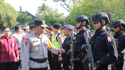 Dalam rangka mengecek kesiapan pengamanan, Kapolda Bali, Irjen Pol. Ida Bagus Kade Putra Narendra, S.I.K., M.Si. memimpin langsung apel kesiapan pasukan Ops Puri Agung VIII-2023 di sentral parkir ITDC, Nusa Dua, Senin (16/10/2023).