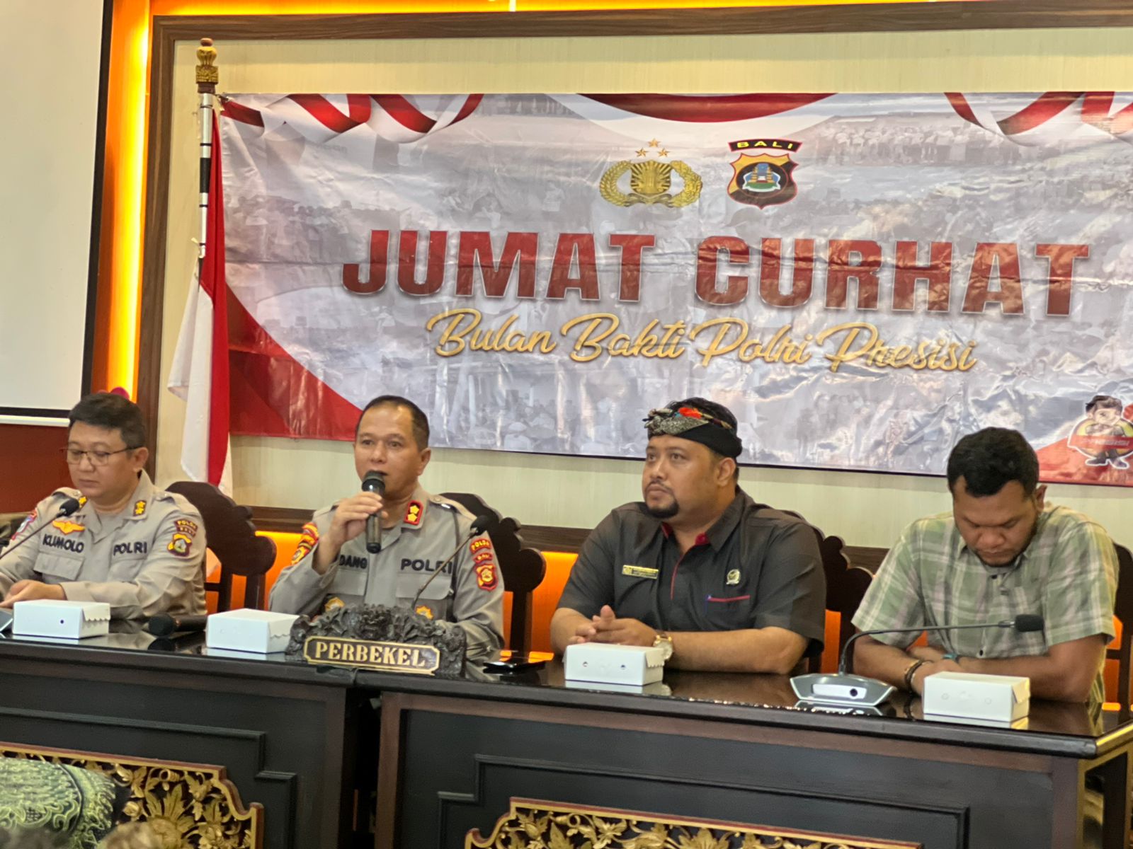 Dirsamapta Polda Bali diwakili Oleh Kasubdit Dalmas Ditsamapta Polda Bali. Menjelaskan terkait kegiatan Jumat Curhat adalah program yang didorong oleh Mabes Polri, guna menampung keluhan atau aspirasi masyarakat adapun kunci Jumat Curhat adalah membangun informasi dua arah dan bisa terbangun kolaborasi untuk menjaga kamtibmas yang kondusif.