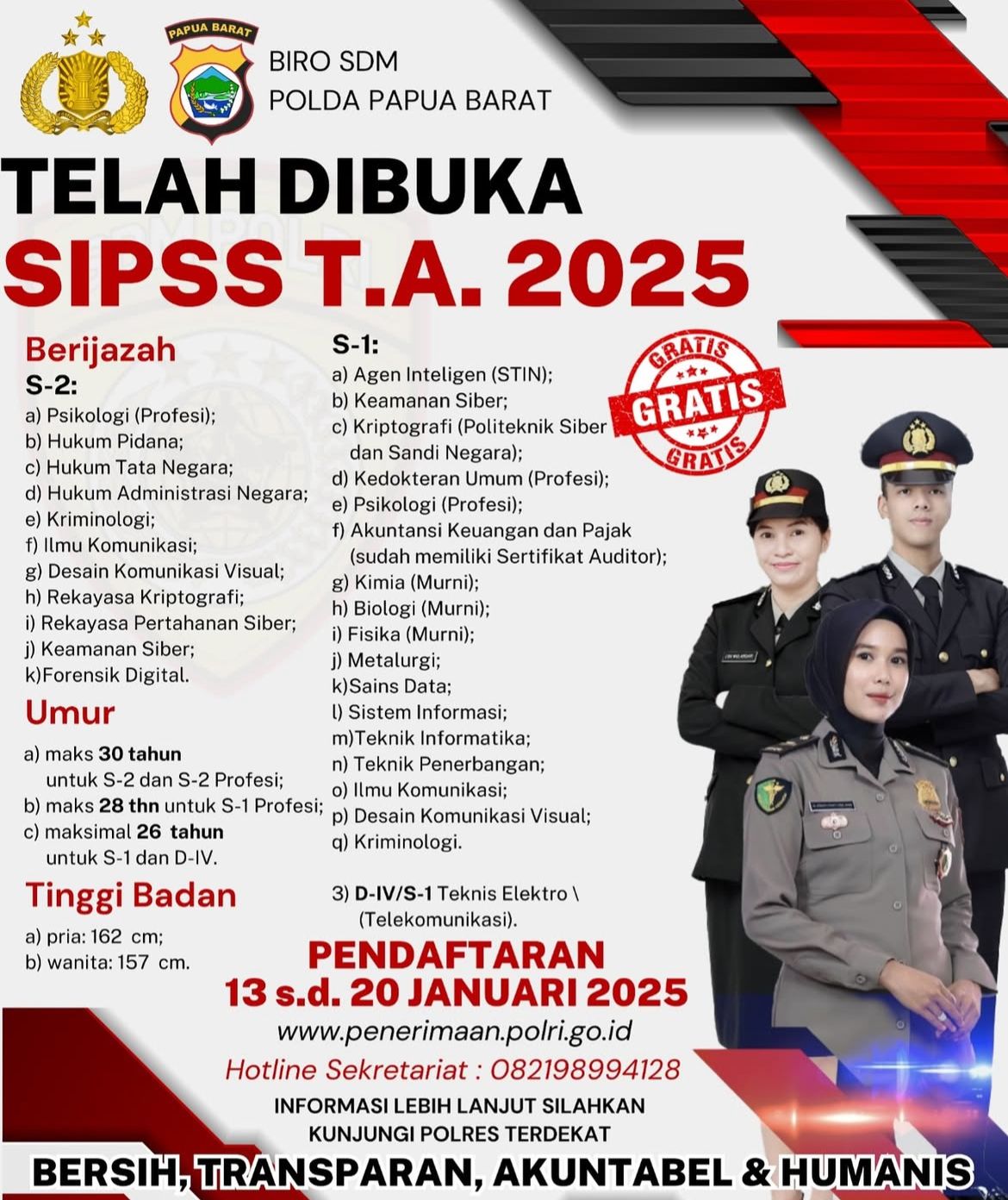 MANOKWARI PB, BUSERJATIM.COM GROUP – Polda Papua Barat melalui Biro SDM Polda Papua Barat membuka pendaftaran Sekolah Inspektur Polisi Sumber Sarjana (SIPSS) Polri tahun anggaran 2025 dalam rangka memenuhi kebutuhan organisasi melalui pengembangan kekuatan personel Polri Sumber Sarjana.