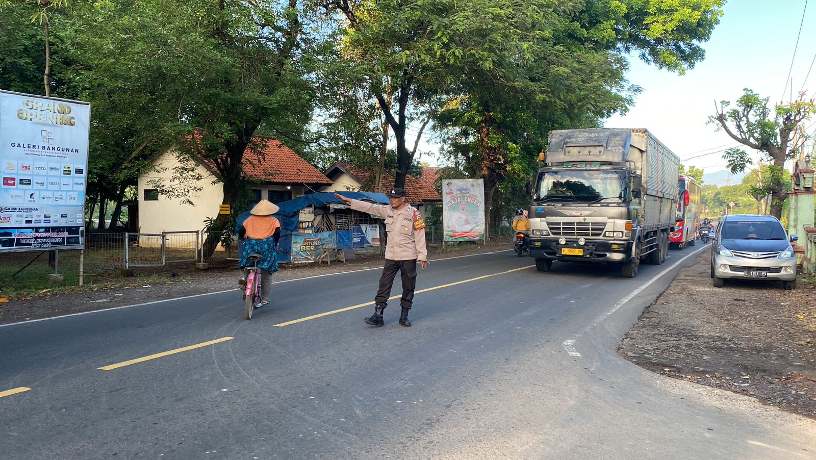 Majalengka – Personil Polsek Dawuan, Polres Majalengka, Polda Jabar, Aiptu Sri Yanta bersama Bripda Kevin Aditya F., melaksanakan pengaturan lalu lintas pagi di persimpangan Desa Sinarjati, Kecamatan Dawuan, Kabupaten Majalengka, pada Selasa (9/7/2024).