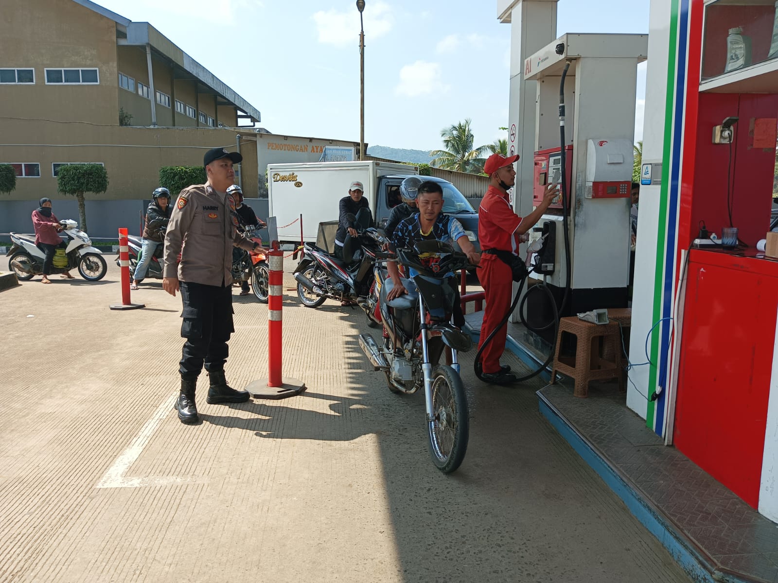 “Dari hasil pantauan di SPBU, aktifitas pengisian BBM berjalan lancar tidak nampak antrean panjang pengendara bermotor untuk melakukan pengisian BBM.” tandas Kapolsek.