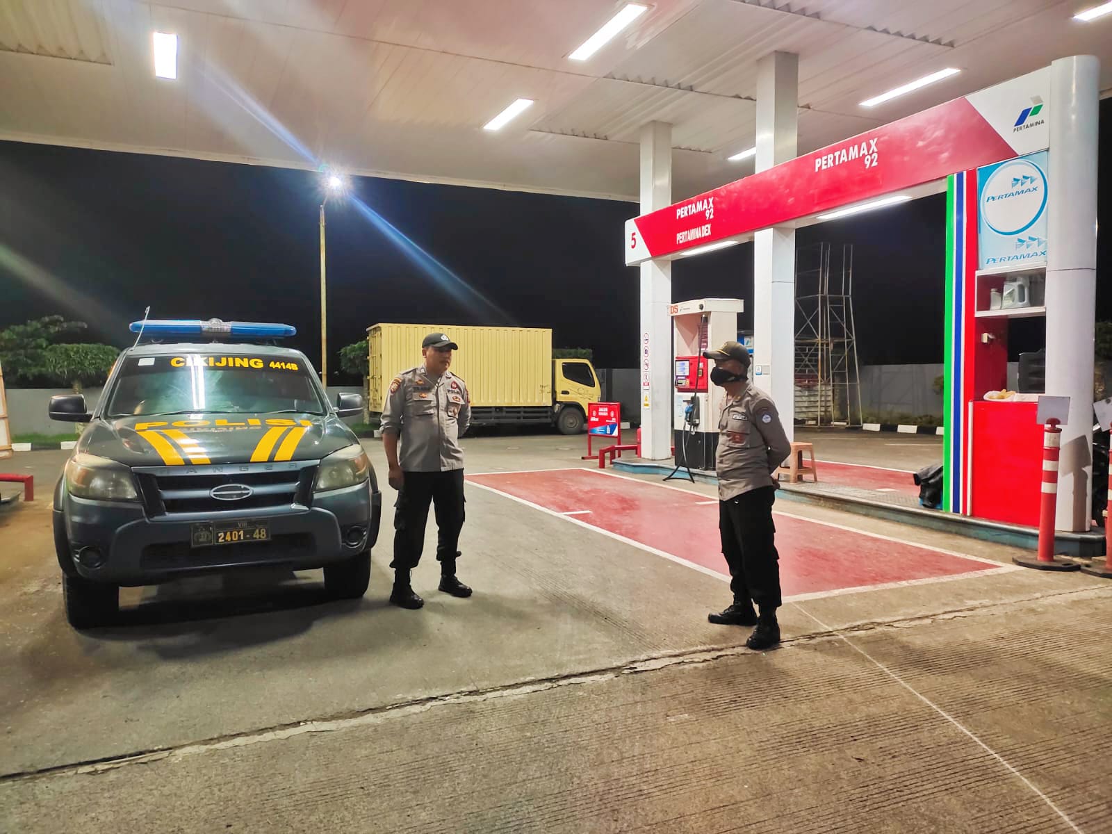 Majalengka – Bhabinkamtibmas Polsek Cikijing Polres Majalengka Polda Jabar, Bripka Dede Arif dan Briptu Fadli secara rutin melaksanakan pengamanan dan monitoring di SPBU Cikijing. Jumat (30/06/2023) malam.